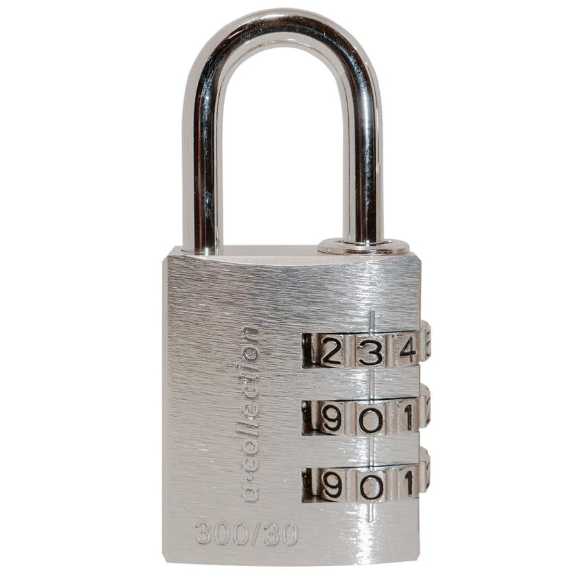 Kombinationslås 300/30 från a-collection är ett hänglås som består av delvis återvunnen aluminium och en härdad stålbygel. Hänglåset är lämpligt för låsning av väskor, koffertar, kistor, kassetter, klädskåp med mera. Låsets sifferkod går att ställa in individuellt med de tre kodhjulen.