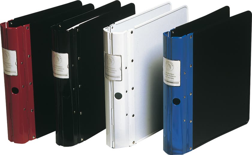 Med mekanism och med en solid konstruktion bestående av metallrygg och gångjärn tillsammans med fästplatta, klor och fingertryck, som ger skydd till dina dokument från stötar vid transport.