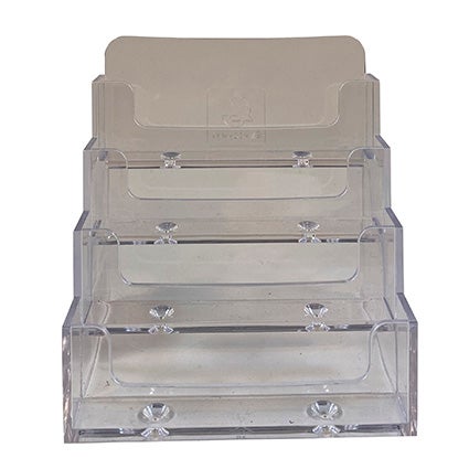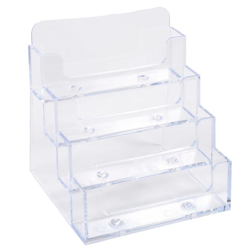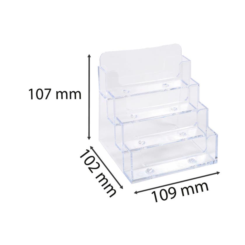 Visitkortsställ i glasklar polystyrenplast. Fyra fack för förvaring av upp till 50 kort i varje fack.