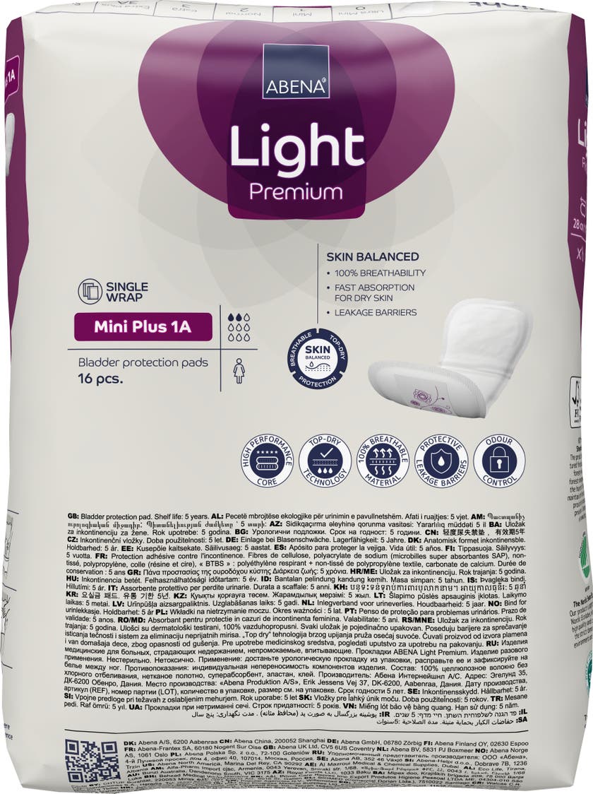 Inkontinensskydd Light Mini Plus 1A. Abena Premium. Skydd mot urinläckage vid lätt till måttlig inkontinens. An.passad till kvinnor