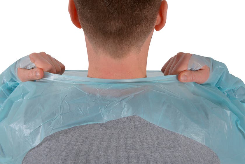 Engångsförkläde av plast med långa ärmar och tumöglor, nackband och knytband i ryggen.