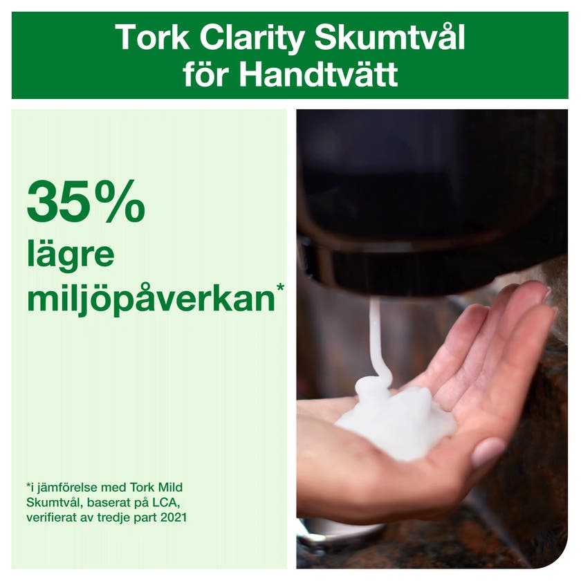 Tork Clarity Skumtvål för handtvätt är tillverkad till 99% med omsorgsfullt utvalda ingredienser av naturligt ursprung, som har en mindre inverkan på vattenmiljön och designad med hållbarhet i åtanke. Denna biologiskt nedbrytbara formulering har en lägre inverkan på vattenlevande liv och är skonsam mot huden.