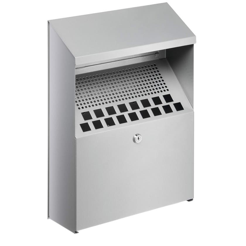 Väggmonterad askkopp av metall för montering i skyddat läge utomhus. Innerbehållare som är lätt att tömma. Låsbar tömningslucka med 2 nycklar.