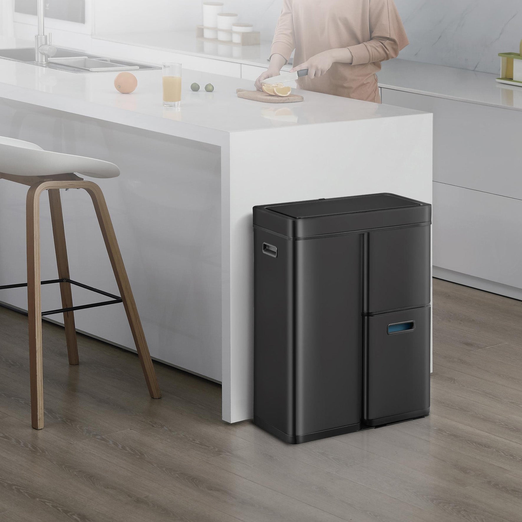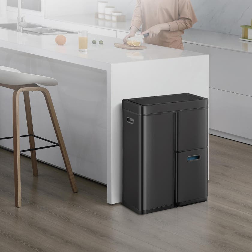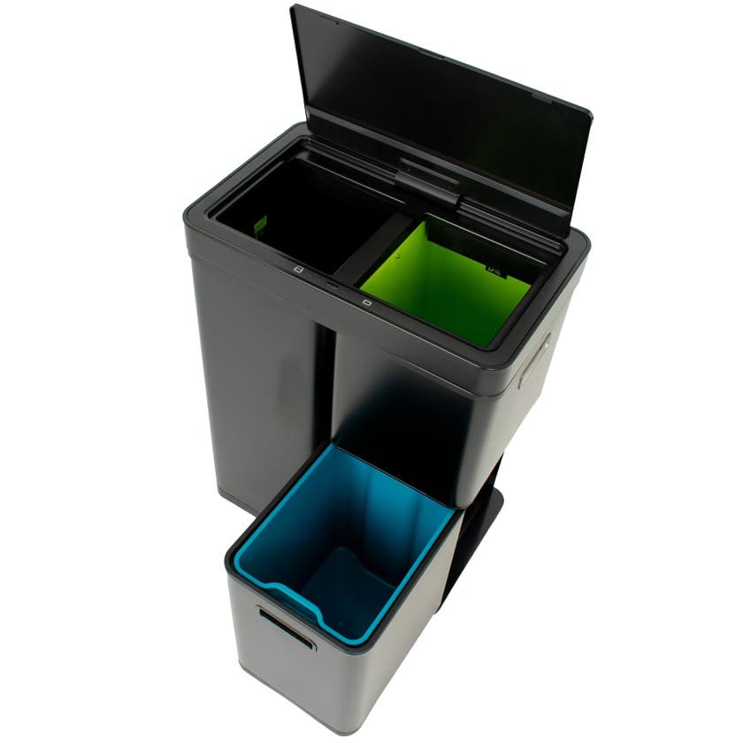 Mirage Plus är ett svart, designat kärl med sensorstyrt lock över två separata uttagbara sorteringskärl i plast. Snygg och praktisk design för både hemmet och arbetsplatsen. Det tyststängande locket i plast kan även öppnas med knapptryck. Locket drivs med 6st AA-batterier (ingår ej). En utdragbar låda undertill med sorteringskärl i plast.