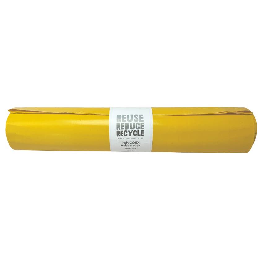 Asbestsäcken PolyCOEX är tillverkad av flera skikt 100% återinsamlad, återvunnen LDPE. Extra stark, dubbelsvetsad säck med vit insida och gul utsida speciellt framtagen för asbestavfall.