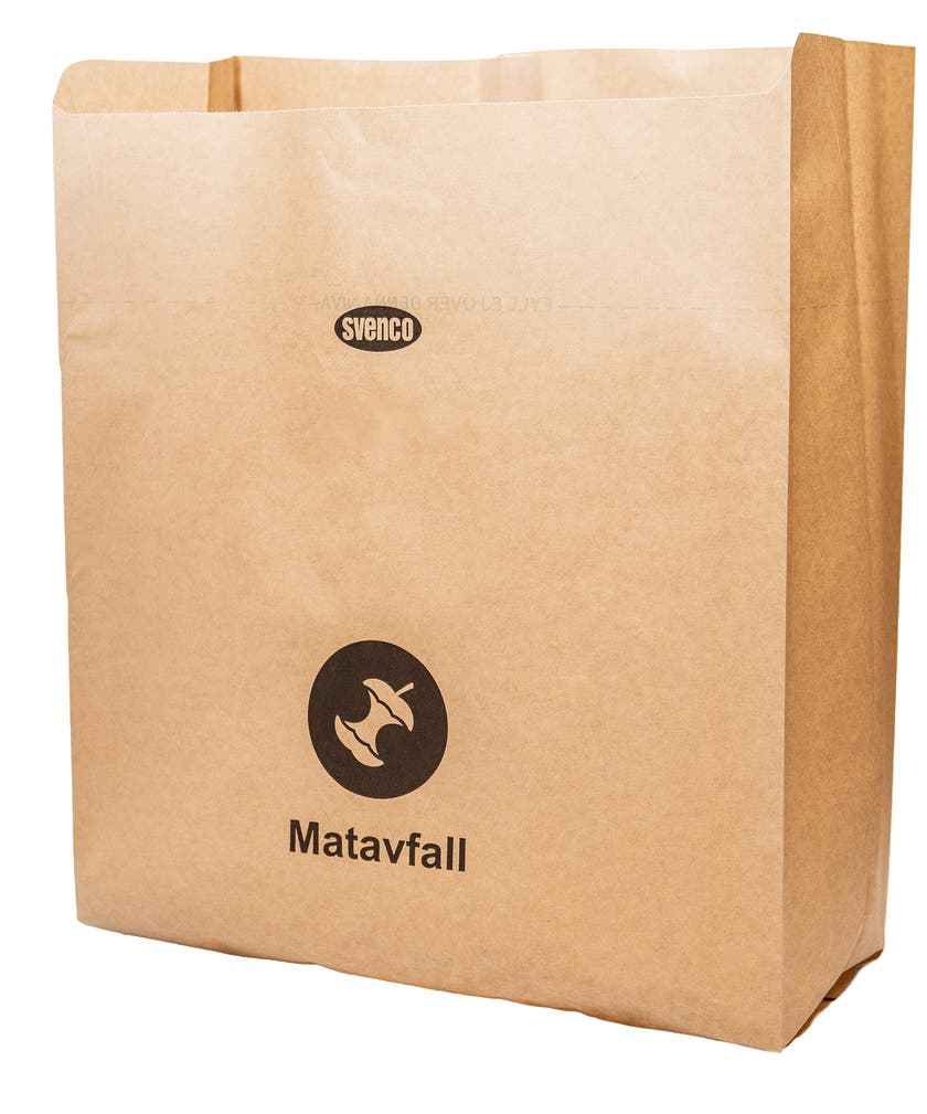 Matavfallspåse 12 Liter. Tillverkad av vattenavvisande kraftpapper, WR-papper. Framförallt framtagen för mindre verksamhetskök, t ex förskola och kontor. Påsen har ett standardtryck.