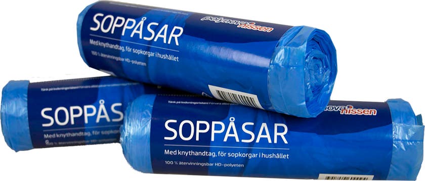 Blåa soppåsar för köksavfall med knythandtag. Passar även i papperskorgen.