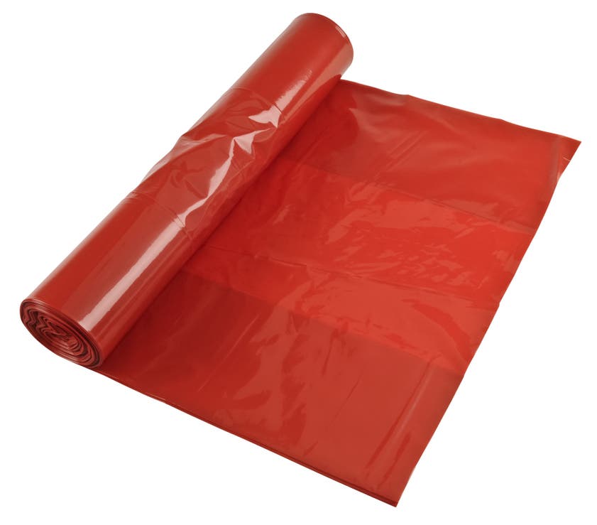 Prima säckar på rulle, anpassade för optisk sortering vid avfallsanläggning. Den röda färgen markerar brännbart avfall. Placeras gärna i en säckställning.