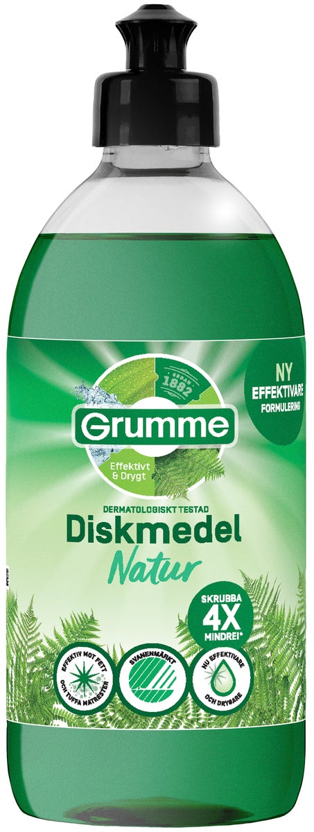 Diska effektivt och miljömärkt med Grumme handdiskmedel som finns i flera härliga dofter. Tar snabbt och effektivt bort tuff och envis smuts och lämnar disken glänsande ren. Tar effektivt tar bort dålig lukt som kommer från fisk, vitlök och matrester, både från din disk och från din disktrasa. Diskmedlet är drygt och effektivt och miljömärkt med Svanen. Innehåller heller inga animaliska ingredienser och är certifierat av Vegan Society. Dermatologiskt testad på känslig hud. Flaskan består av 100% återvunnen plast.