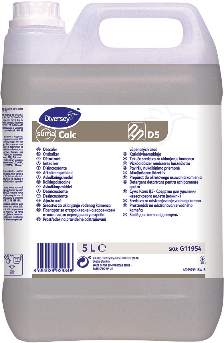 Suma Calc D5 är ett högkoncentrerat surt rengörings- och avkalkningsmedel för att avlägsna svåra föroreningar och kalkbeläggningar på diskmaskiner, kaffebryggare, kokgrytor och annan utrustning i storkök.