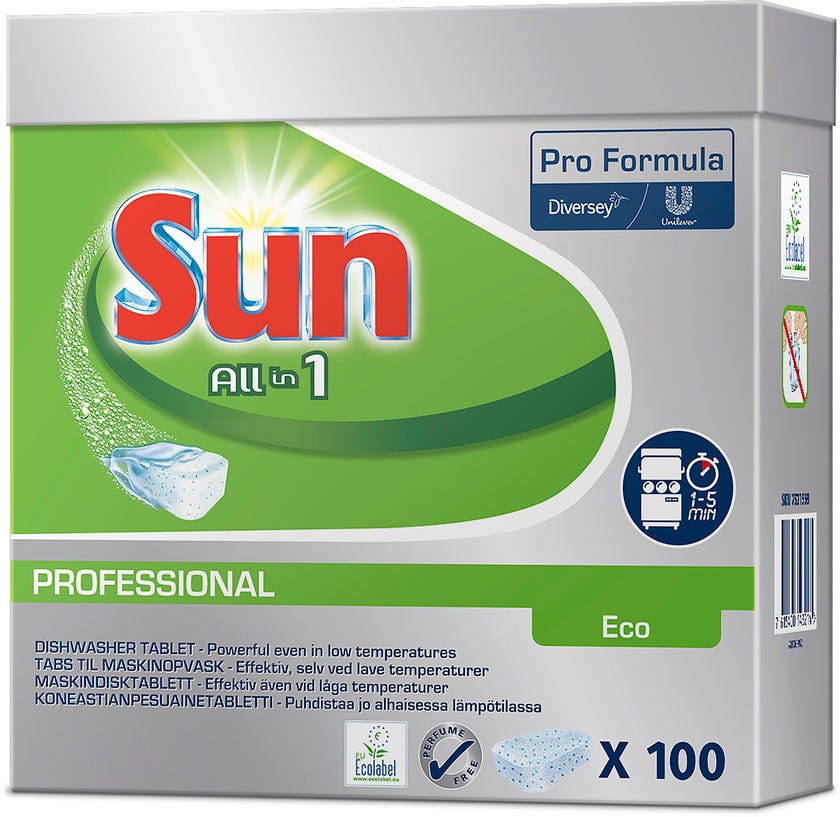 Sun Professional All in 1 Eco är ett miljömärkt, professionellt maskindiskmedel, inklusive saltfunktion och spolglans, i tablettform för manuell dosering.Enzymbaserad maskindisktablett i vattenlöslig folie, parfym- och fosfatfri.