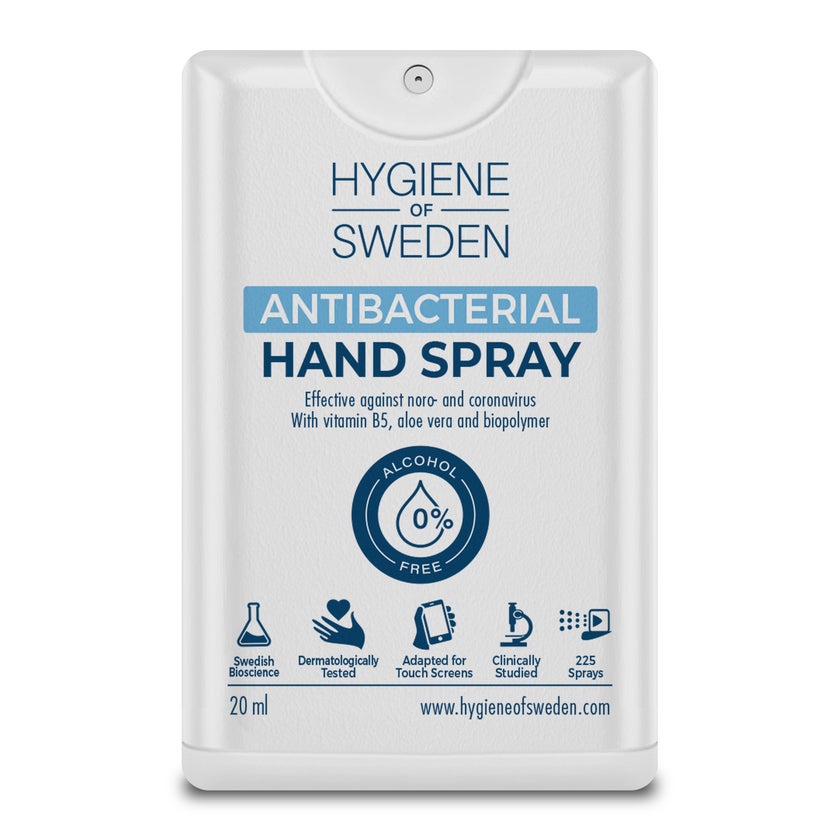 Alkoholfri handdesinfektion i fickformat. Den praktiska sprayen från Hygiene of Sweden dödar 99,999% av alla bakterier och är effektiv mot corona- och norovirus. Innehåller Biopolymer™plus som är ett kliniskt testat alkoholfritt desinfektionsmedel som är skonsamt mot huden. Torkar ej ut huden och skadar ej material. Kan även användas för att desinficera pekskärmar och mobiltelefoner. Produkten är tillverkad i Sverige.