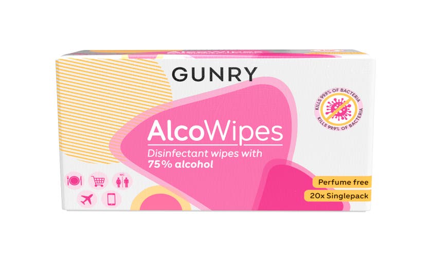 Desinficerande våtservetter. Alcowipes Singlepack från Gunry är en förpackning med 20 st desinficerande våtservetter som är styckförpackade och därmed smidiga att ha med sig i fickan, i handväskan eller i bilen.