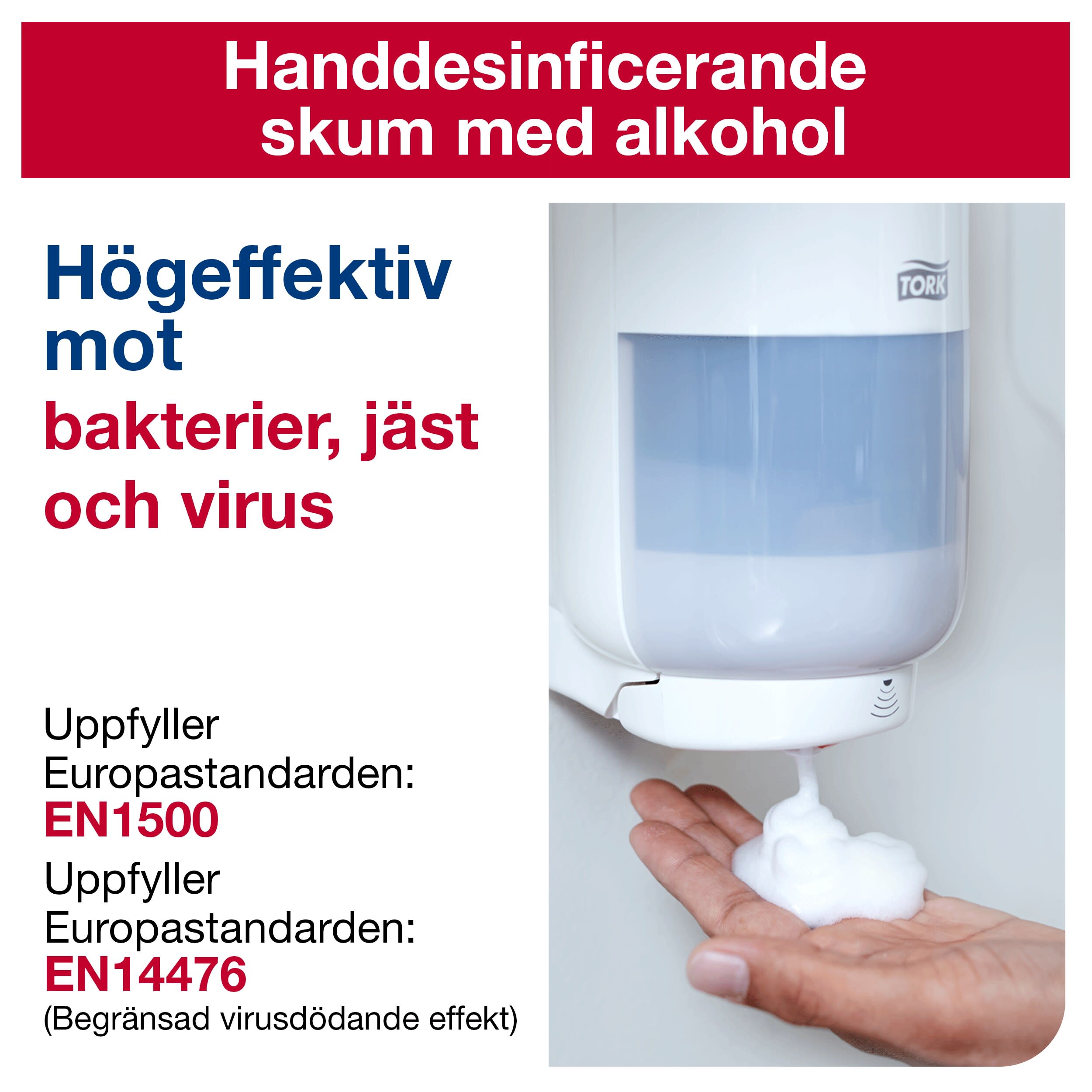 Handdesinfektion skum 75% S4. Förebygg infektioner med Tork Alkoholskum Handdesinfektion. Med 75 % w/w denaturerad alkohol (etanol + isopropanol). Den är idealisk för att rengöra händerna på kontor och andra offentliga utrymmen, eller där vattenfri handhygien behövs. Överensstämmer med den europeiska standarden EN 1500 och EN 14476 (höljeförsedda virus). Lämplig för Tork Skincare-dispensrar, som är bevisat lätta att använda och ger god handhygien till alla användare.