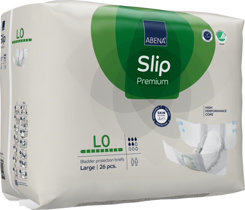 Inkontinensskydd Slip L0. Abena Premium 100 - 150 cm. Anatomiskt formade allt-i-ett-skydd med tejp mot läckage i samband med måttlig till kraftig inkontinens.