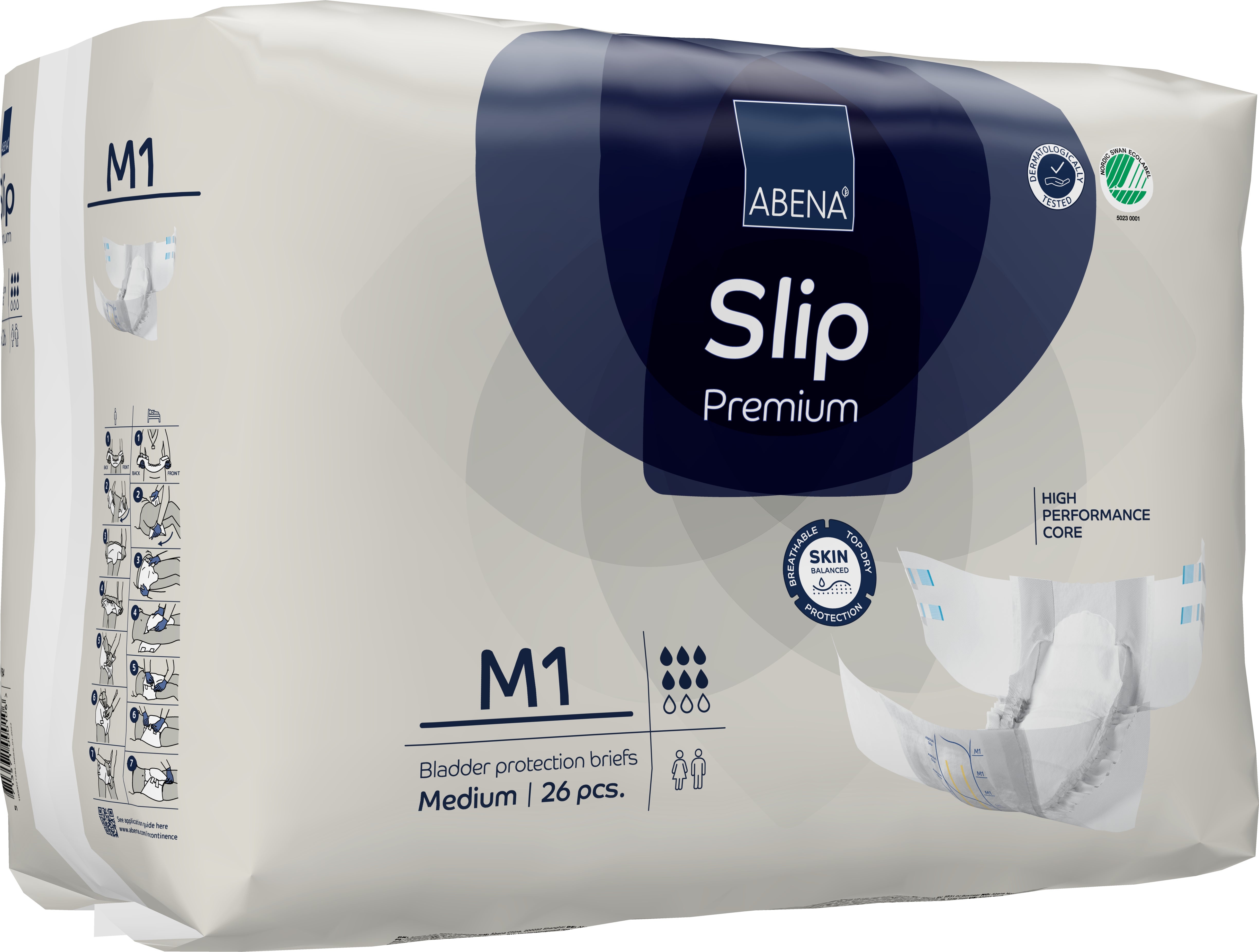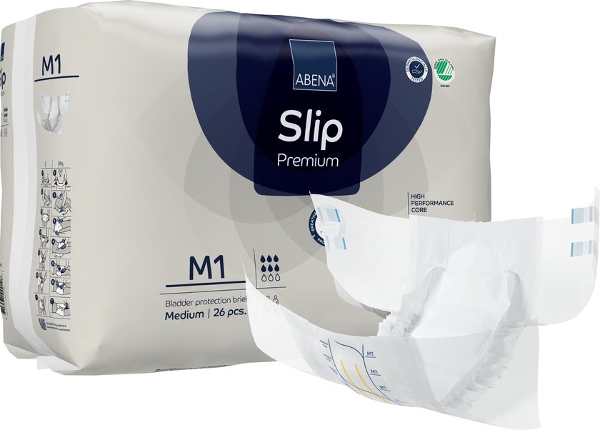 Inkontinensskydd Slip M1. Abena Premium 70 - 110 cm. Anatomiskt formade allt-i-ett-skydd med tejp mot läckage i samband med måttlig till kraftig inkontinens.