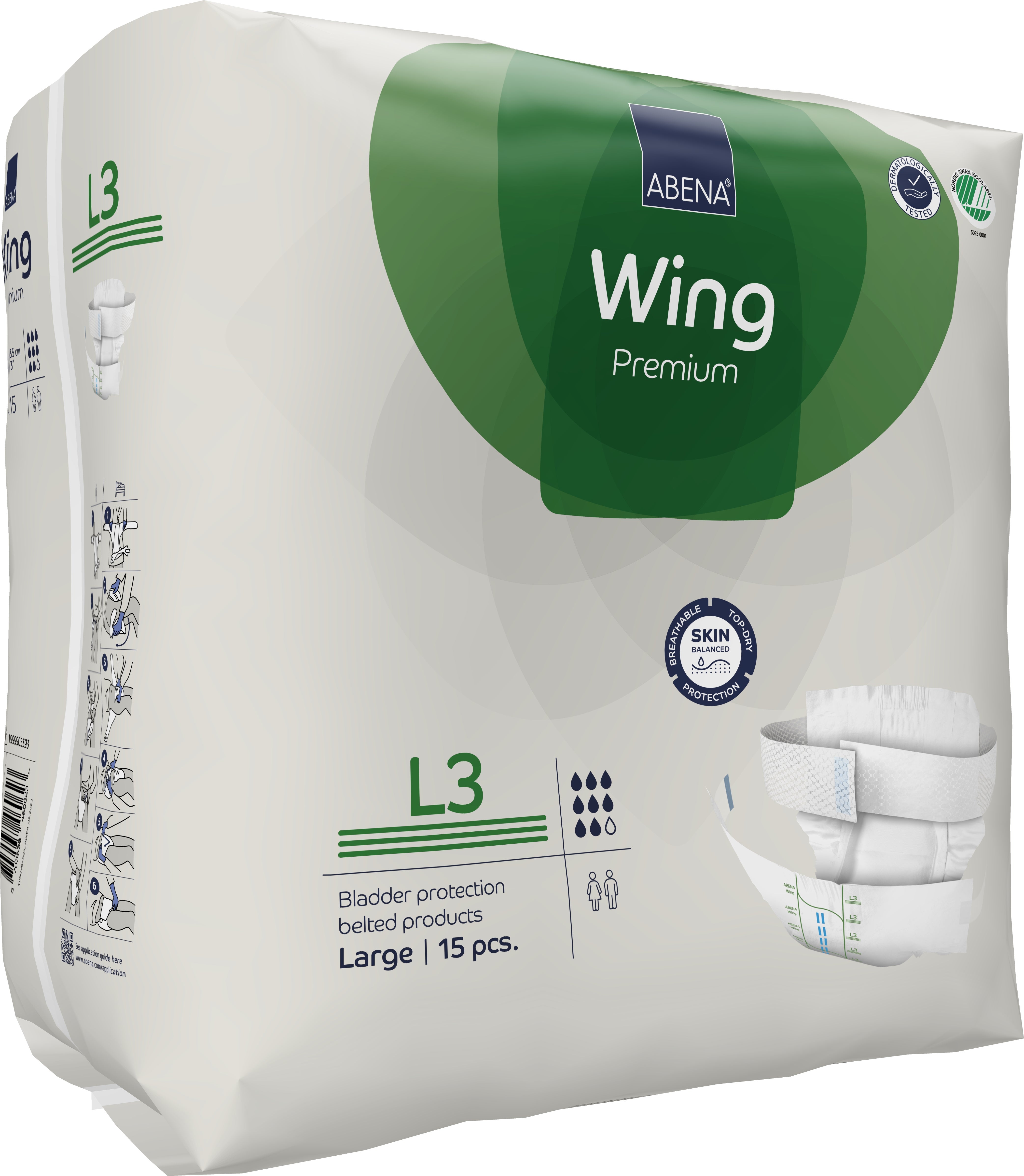 Inkontinensskydd Wing L3. Abena Premium 90 - 135 cm. Bältesprodukt för måttlig till kraftig inkontinens. Bältet är extra långt, så inget behov av separat förlängningsbälte.