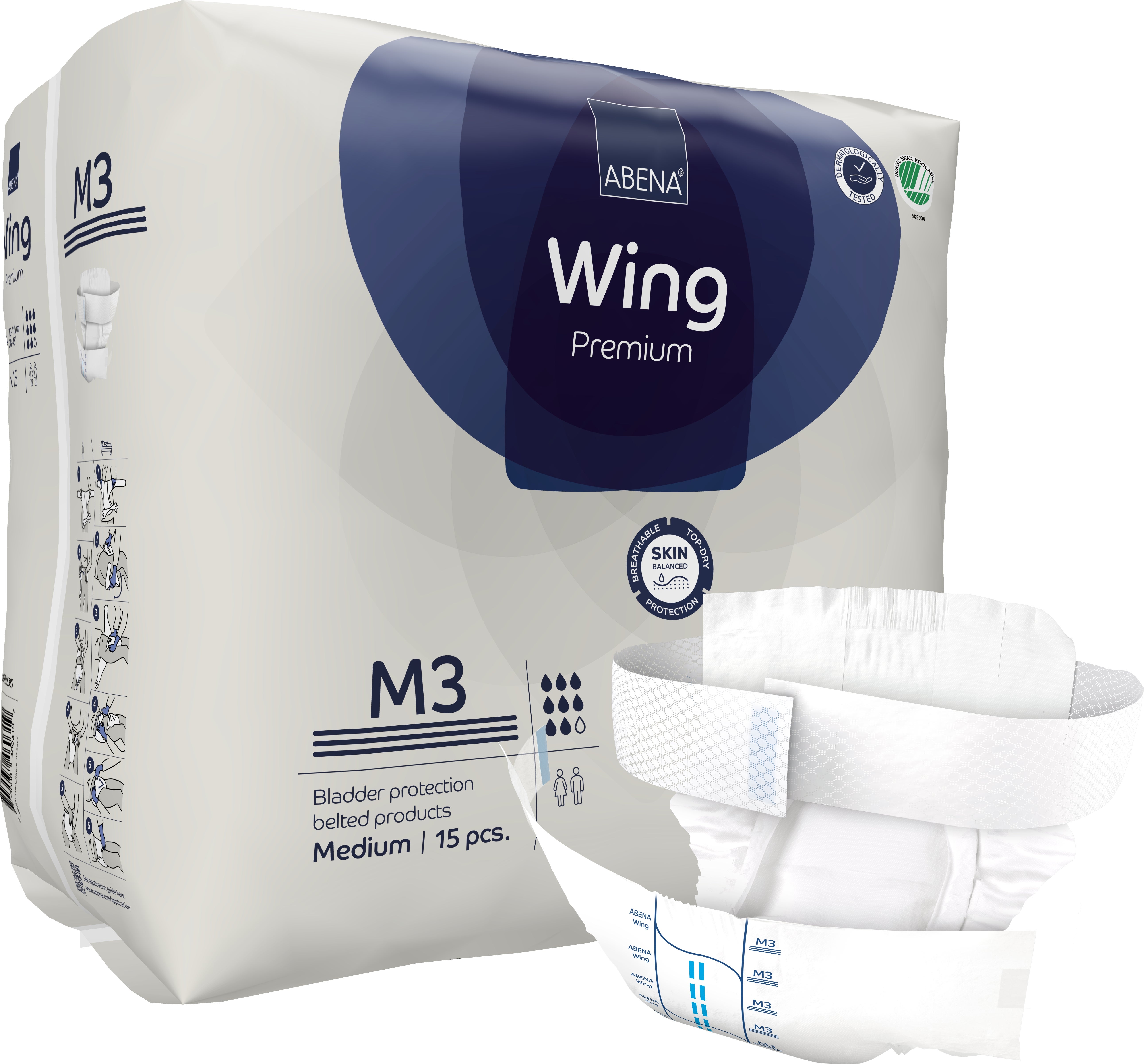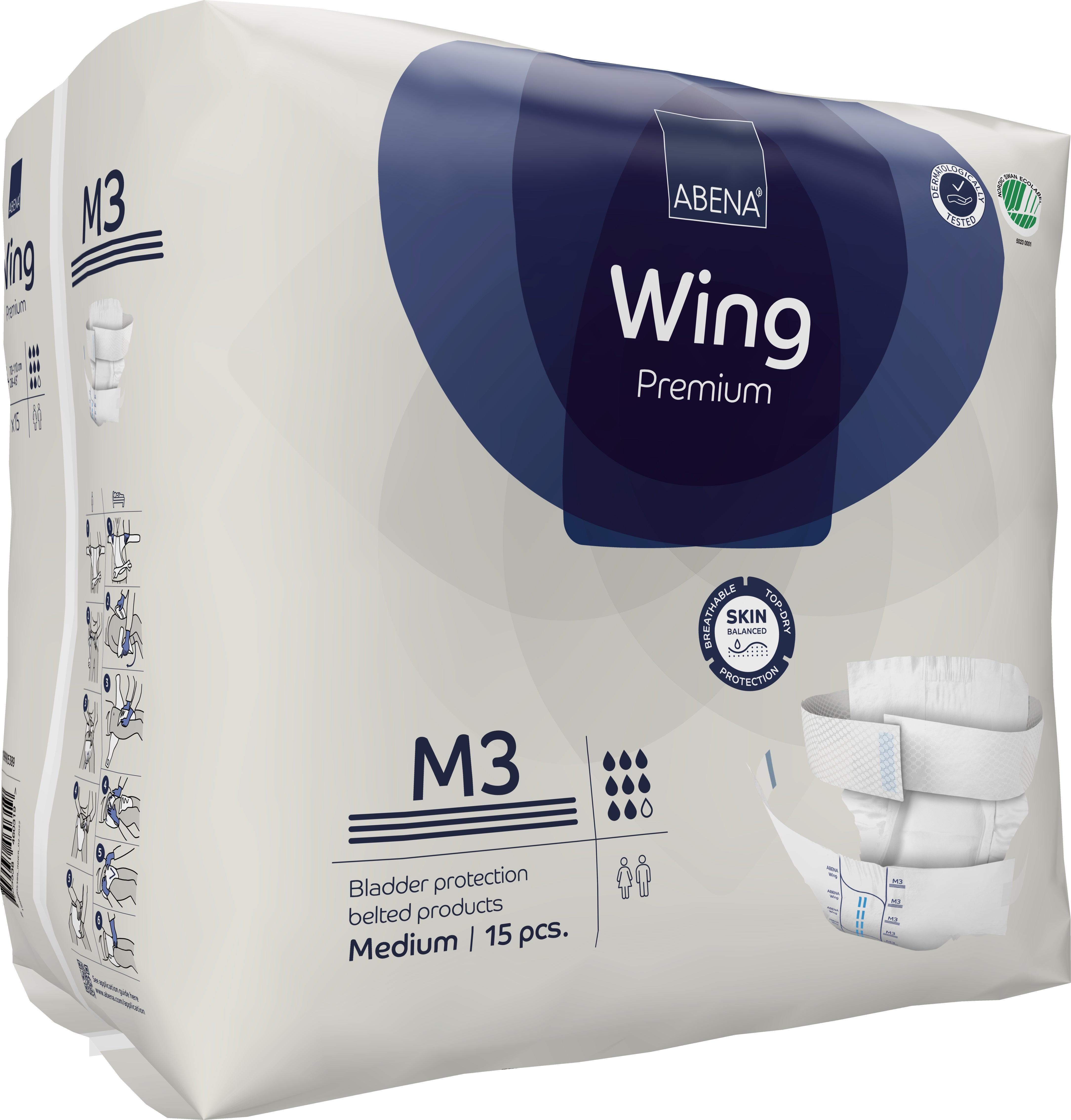 Inkontinensskydd Wing M3. Abena Premium 70 - 110 cm. Bältesprodukt för måttlig till kraftig inkontinens. Bältet är extra långt, så inget behov av separat förlängningsbälte.