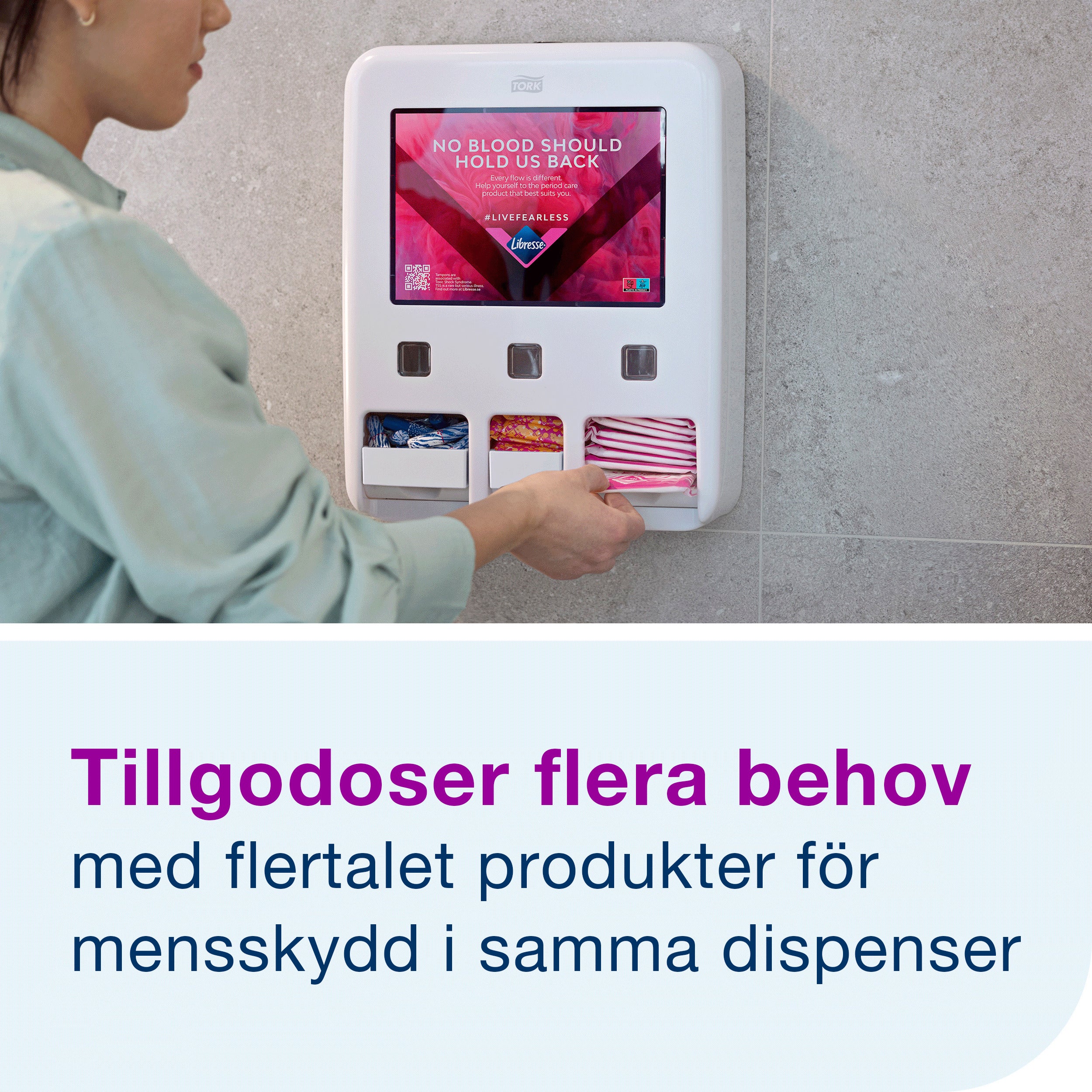 Uppgradera toaletterna med mensskydd och visa att du bryr dig om personal och besökare. I dispensern ryms såväl bindor som tamponger och trosskydd.