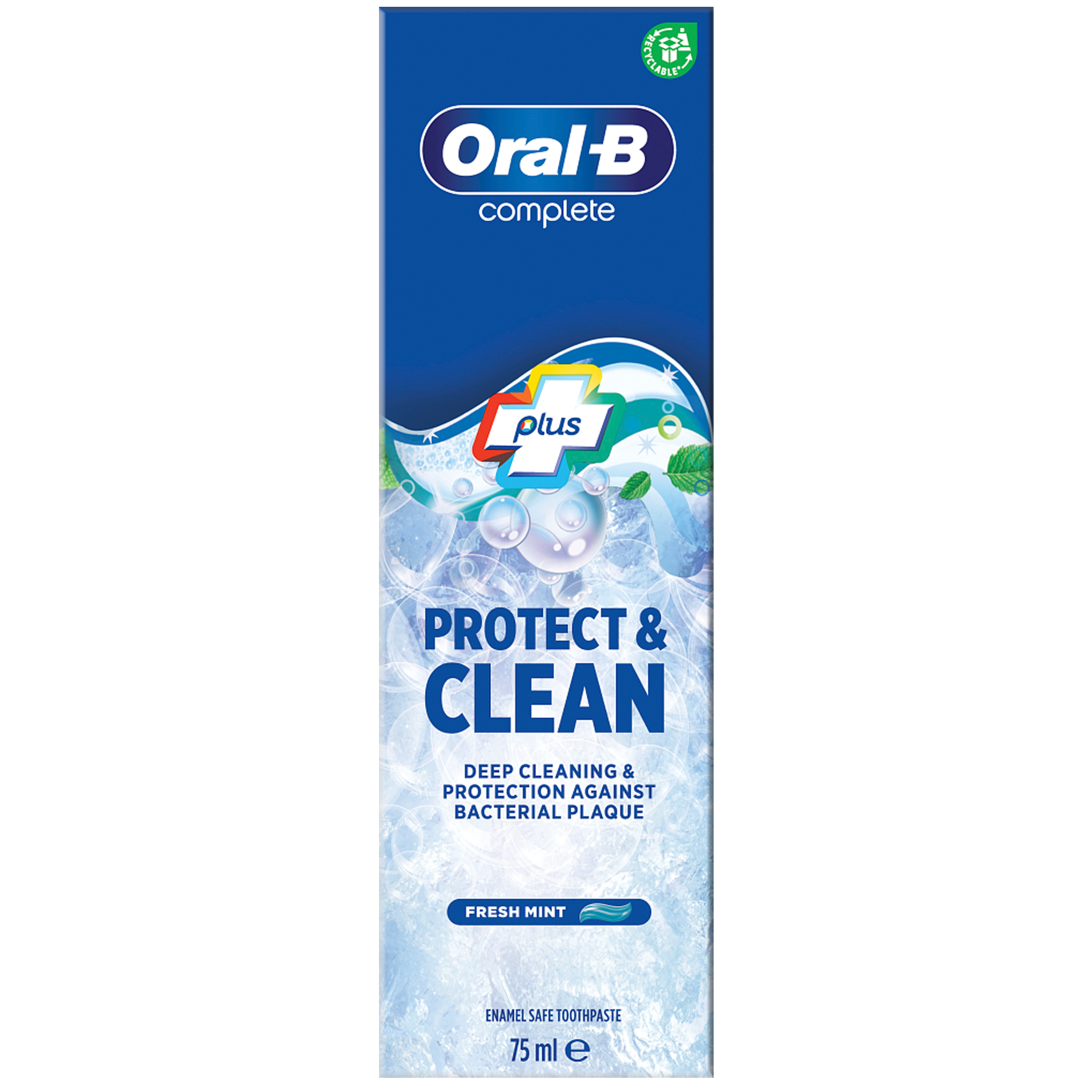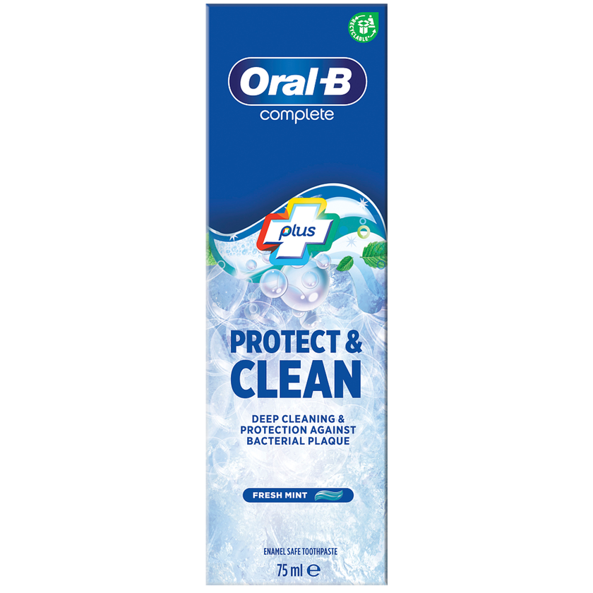 Tandkrämen Complete Protect & Clean från Oral-B ger både effektiv rengöring och ett komplett skydd för hela munnen. Formulan hjälper till att bevara friska tänder och ett starkt tandkött, samtidigt som fluor stärker emaljen och skyddar mot karies.