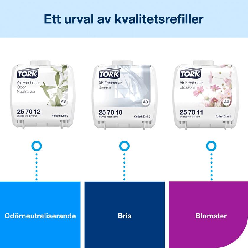 Skapa en behaglig atmosfär i toalettutrymmet med Tork Konstant Airfreshener Dispenser. Unika, högteknologisk distributionsteknologi* doserar parfym kontinuerligt för en varaktig doft som inte försvinner direkt efter sprayning. Airfreshenern eliminerar oönskade lukter samtidigt som den ger en behaglig doft. Intensiteten ställer du in efter eget önskemål.