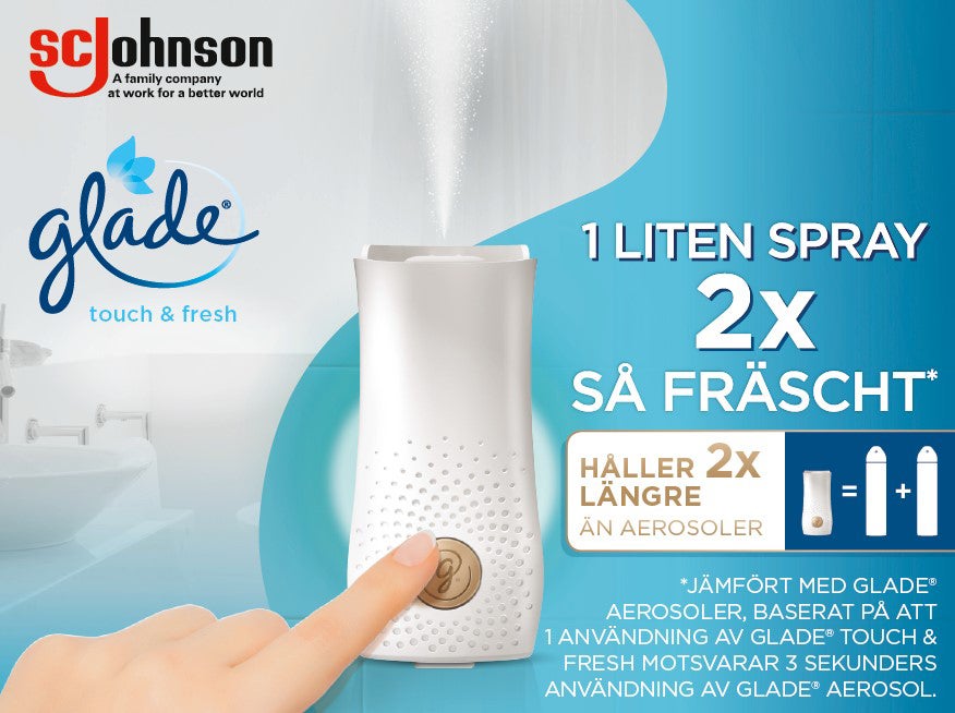 Luktförbättraren One Touch från Glade är den enklaste vägen till fräsch doft i badrum och på toaletter.