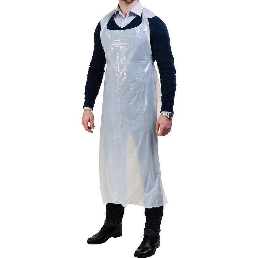 Engångsförkläde av prima LD-polyeten. Träs enkelt över huvudet och knyts bakom ryggen. Används bland annat inom industri och sjukvård. Förpackade på rulle om 50 förkläden.