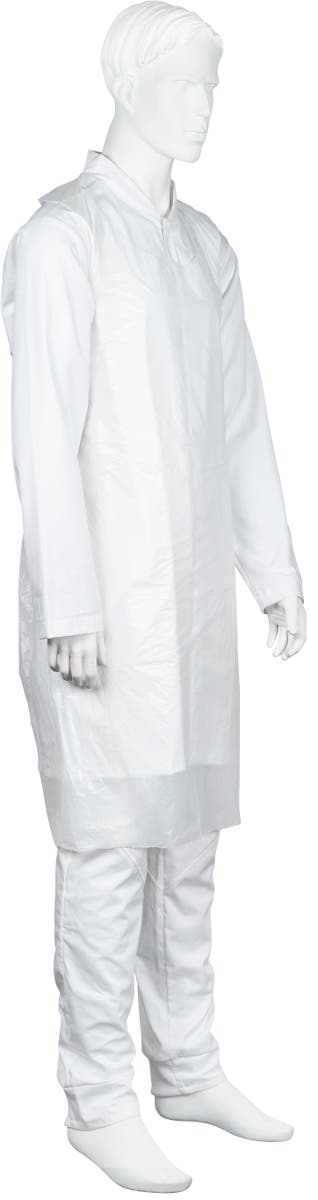 Vitt engångsförkläde med nackband och knytband i ryggen. Förpackningen passar i hållare för handskar. Förklädet används som skydd för användaren där hög hygienisk standard behövs, exempelvis inom hälso- och sjukvårdssektorn, vid livsmedelsproduktion, under produktion eller vid förpackning av varor.