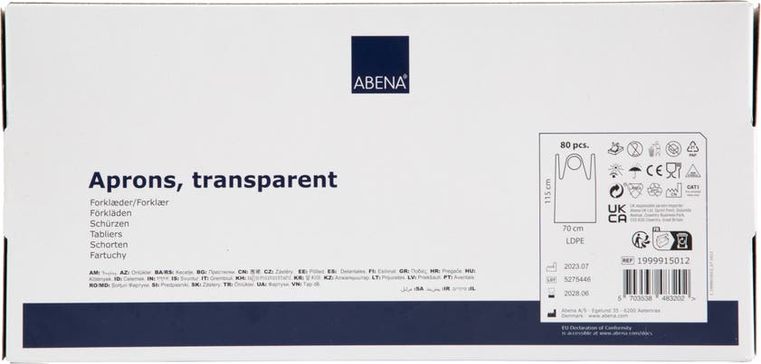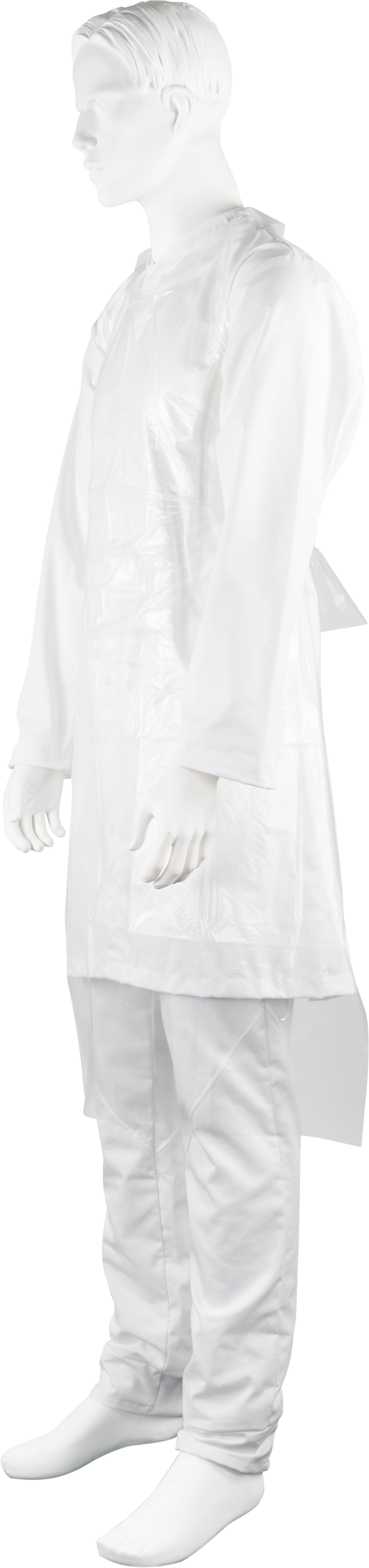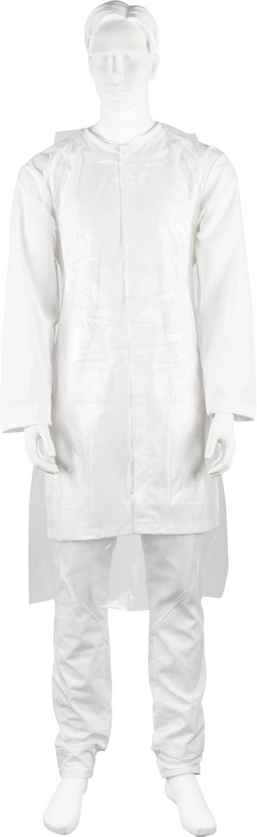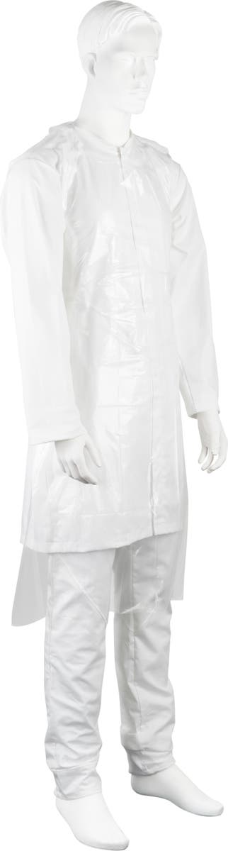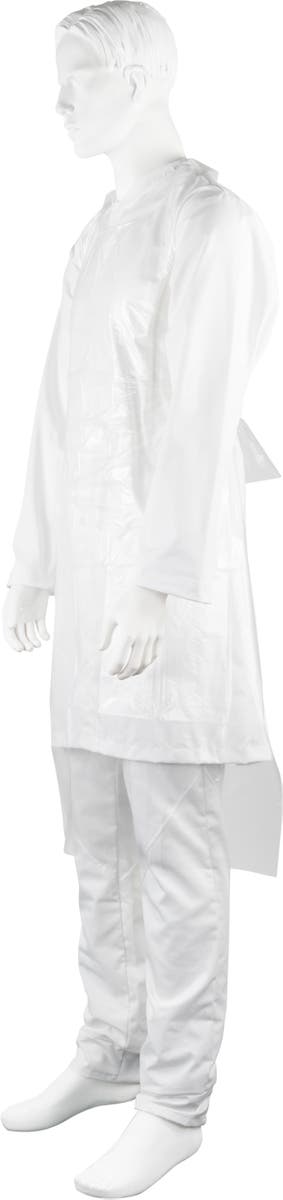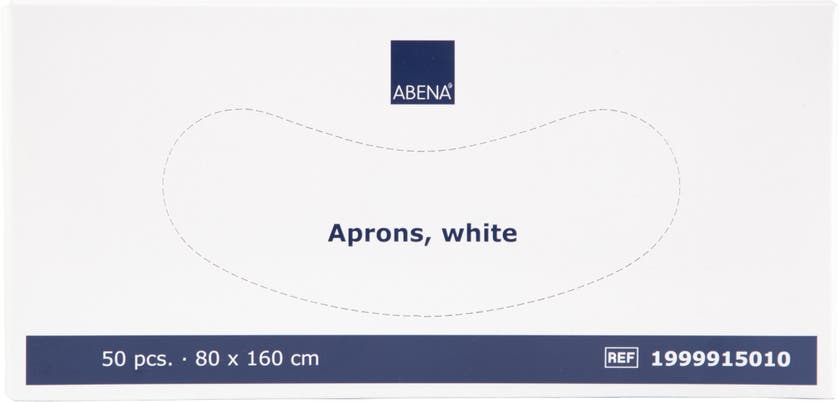 Vitt engångsförkläde med nackband och knytband i ryggen. Förpackningen passar i hållare för handskar. Förklädet används som skydd för användaren där hög hygienisk standard behövs, exempelvis inom hälso- och sjukvårdssektorn, vid livsmedelsproduktion, under produktion eller vid förpackning av varor.