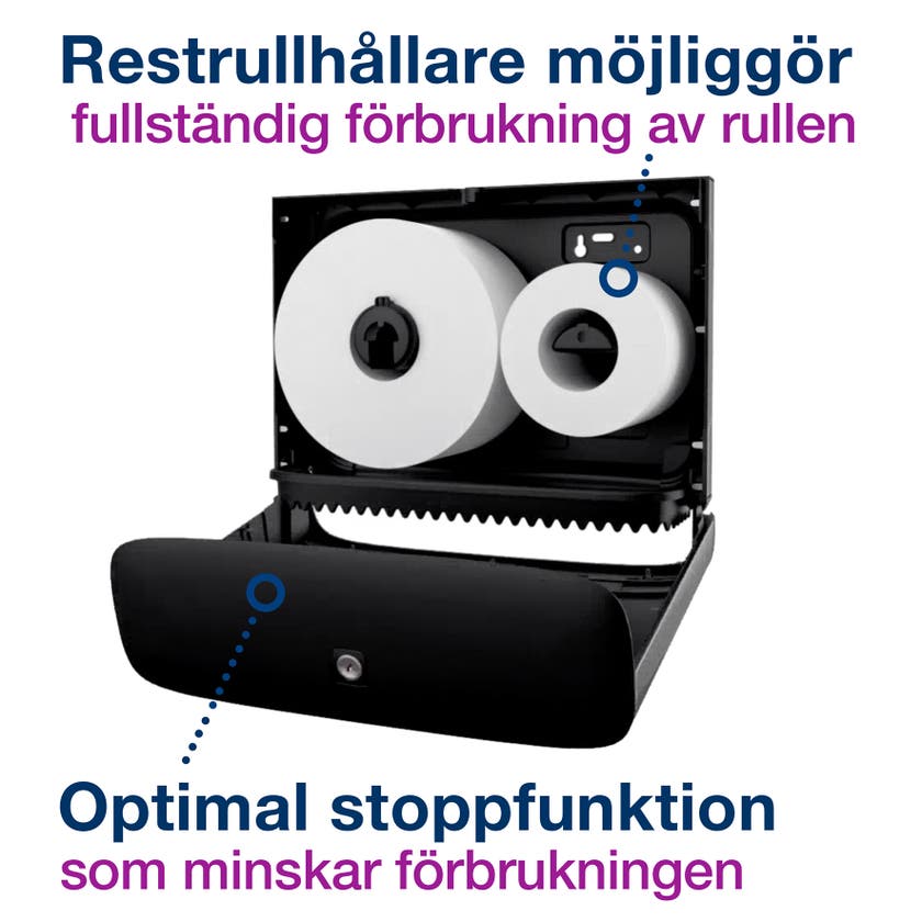 TORK Dispenser Mini Jumbo T2 Toalettpapper. En modern design med släta ytor och rena linjer som smälter in i ditt toalettutrymme. En elegant dispenser med hölje i lätt borstat rostfritt stål med skydd mot fingeravtryck som håller den snygg och ren. <br< Rostfritt stål med skydd/beläggning mot fingeravtryck som ger ett exklusivt intryck och gör den enkel att rengöra. Hög kapacitet som minskar risken för att toalettpappret ska ta slut. Smart hållare för restrullen minskar avfallet. Rullar med restpapper kan användas tills pappret är slut.