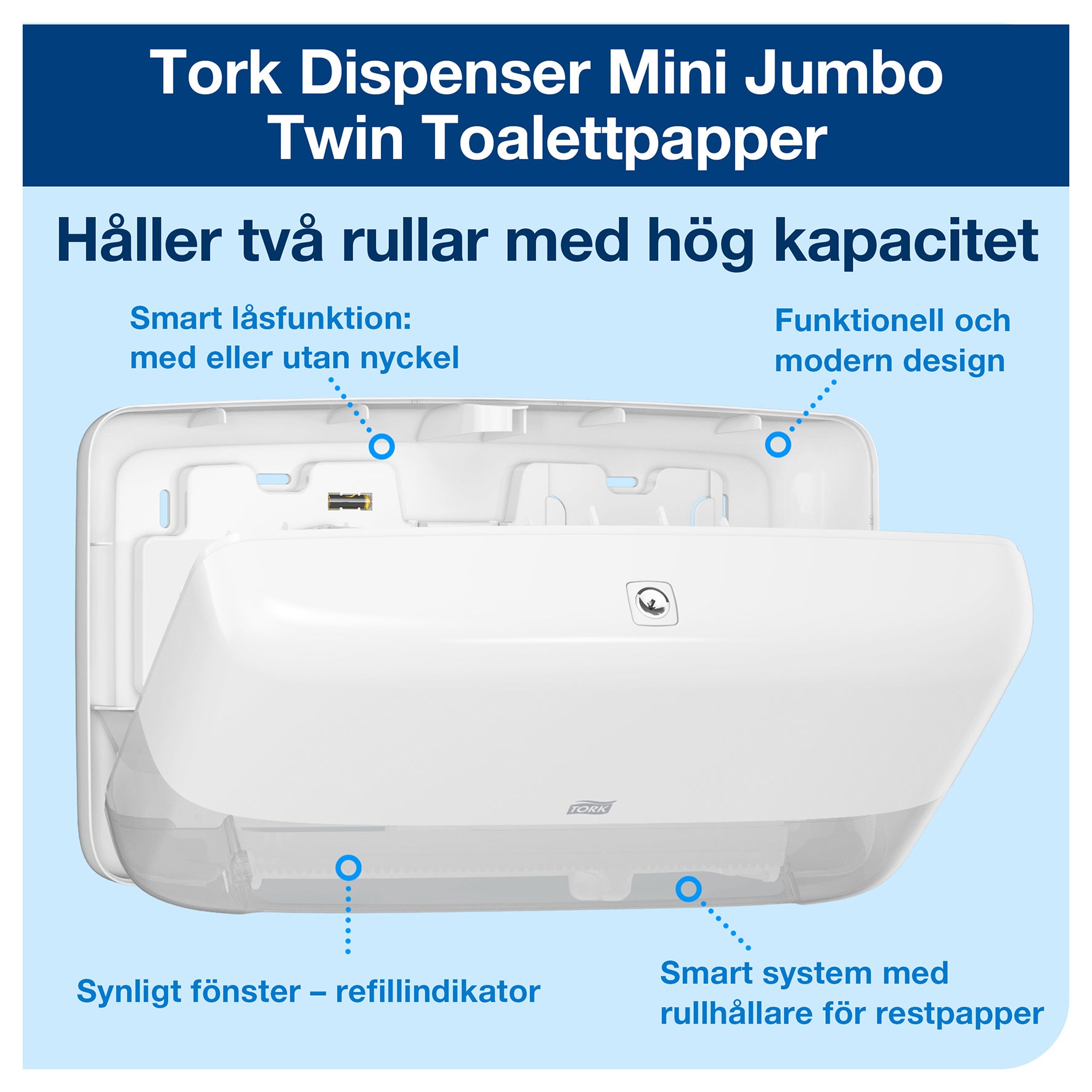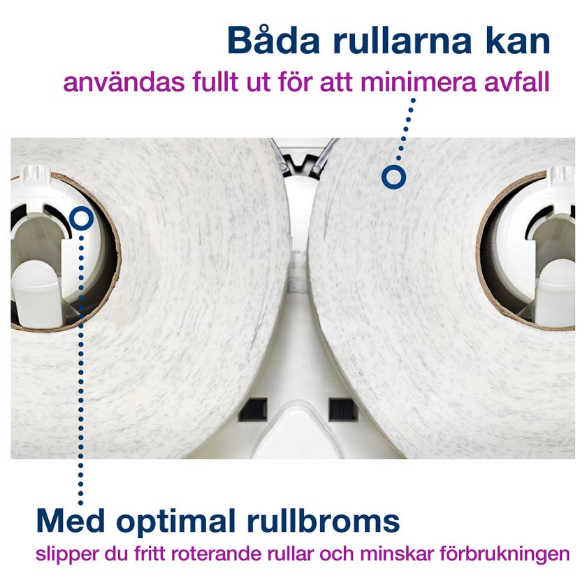 Tork Dispenser Mini Jumbo Twin T2 för Toalettpapper i Elevation design. Passar perfekt för toalettutrymmen med hög besöksfrekvens, där besökarnas upplevelser är lika viktiga som hög effektivitet och låga driftskostnader. Den garanterar att det alltid finns papper, eftersom den innehåller två fulla rullar med hög kapacitet. Tork Elevation dispensrar har en funktionell, modern design som skapar ett långvarigt intryck hos dina besökare. Ladda 2 rullar toalettpapper samtidigt i dispensern Mini Jumbo Twin, så slipper toalettpappret ta slut. Båda rullarna kan användas fullt ut för att minimera avfall. Optimal rullbroms undviker fritt roterande rullar och minskar därmed förbrukningen. Genomskinligt fönster gör det möjligt att se när det är dags för påfyllning.