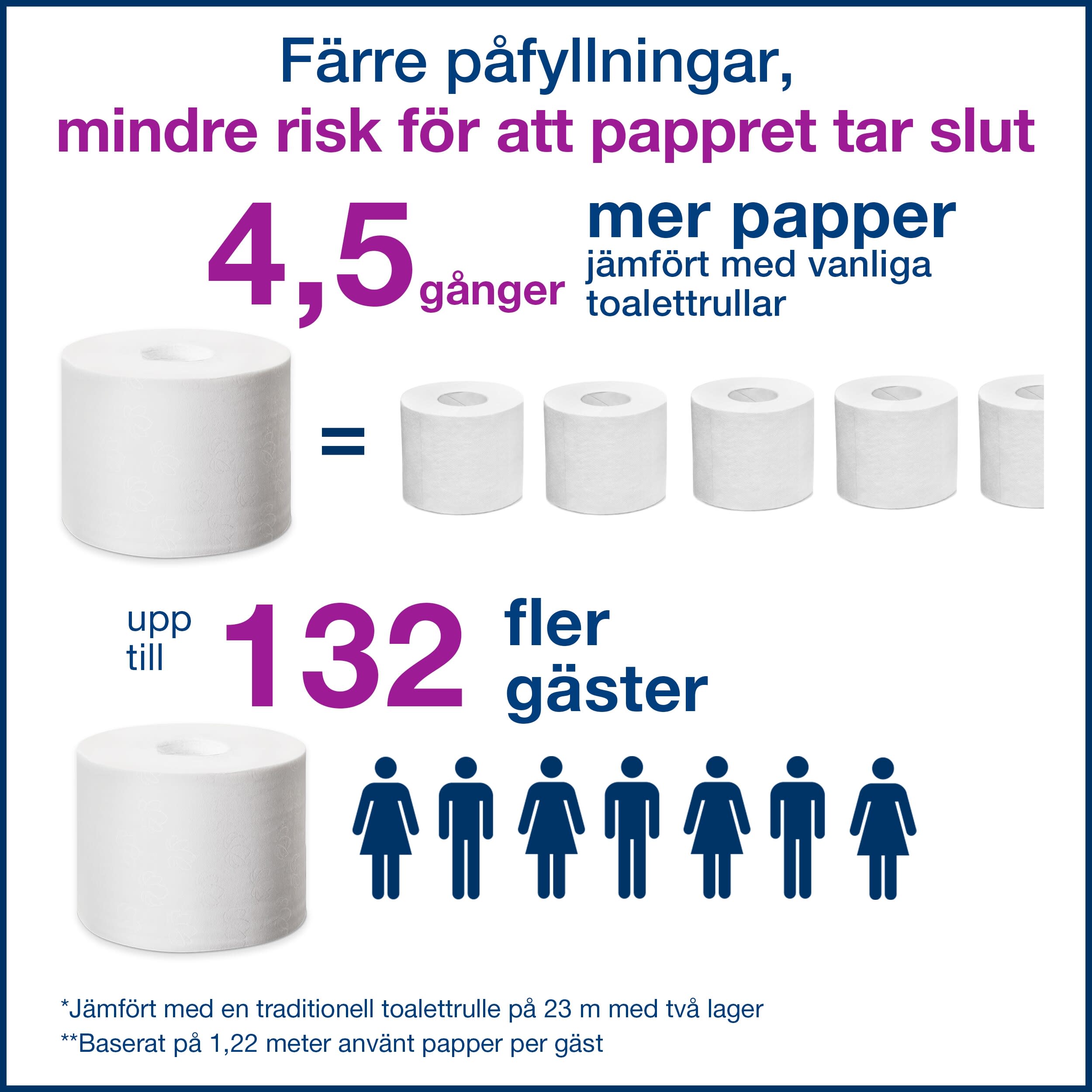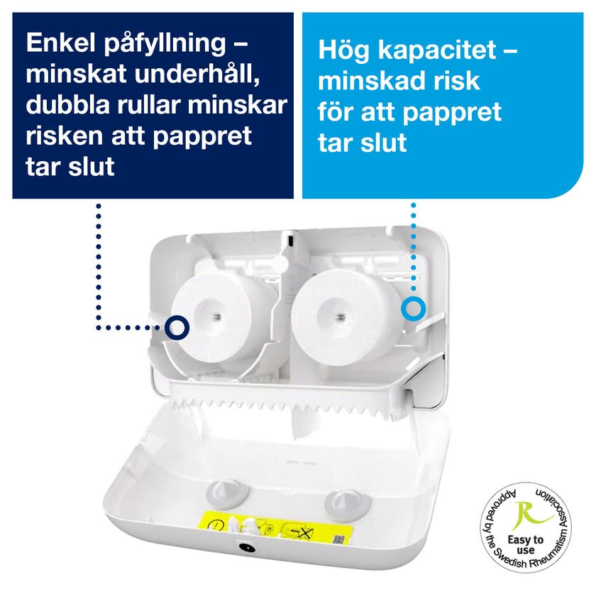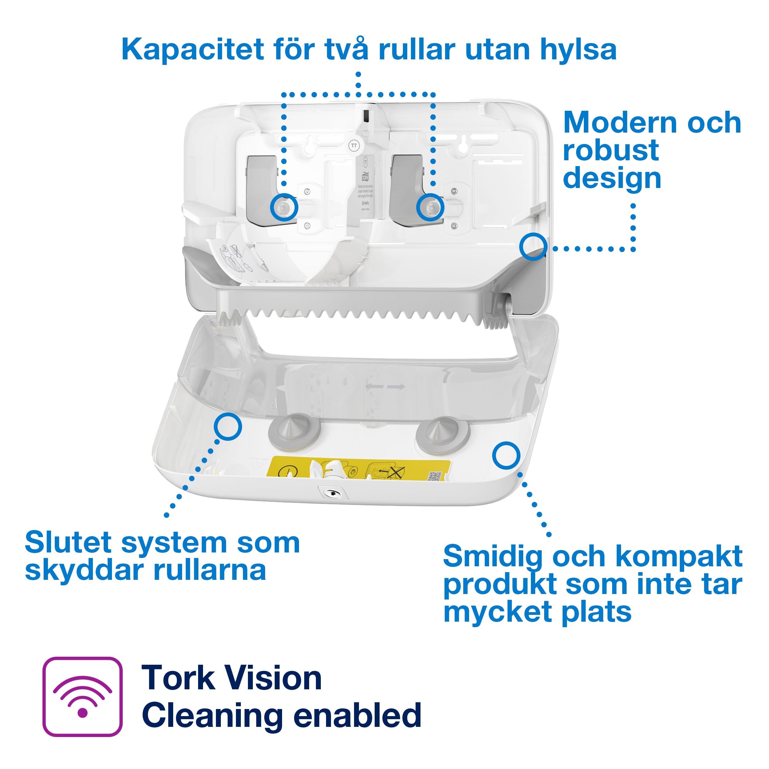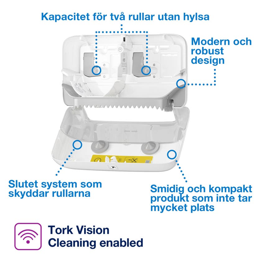 Tork Dispenser Coreless Mid-size Twin Toalettpapper, utan hylsa passar perfekt för toalettutrymmen med låg till medelhög trafik där kundnöjdheten står i centrum. Med plats för upp till nio gånger mer papper än två vanliga toalettpappersrullar garanteras hög effektivitet och att toalettpapper alltid finns till hands. Dispenser för dubbla rullar som är enkel att fylla på och säkerställer att papper alltid finns tillgängligt. Dispenser med hög kapacitet som har plats för två mellanstora rullar, vilket ger ett minskat påfyllningsbehov. Slutet system som skyddar rullarna: förhindrar stöld och förbättrar hygienen. Enkel att fylla på: mindre underhåll. Snygg och enkel design som ger ett bättre intryck. Tork EasyCube - datadriven städning. Det tidsbesparande systemet med information till städpersonalen i realtid.