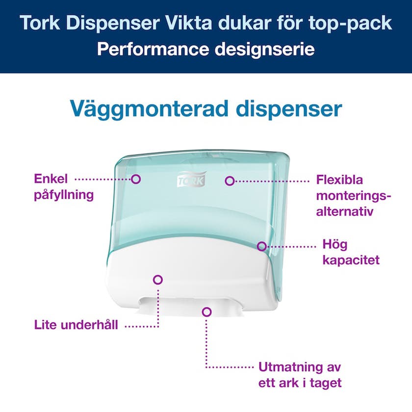 Tork Dispenser W4 för Vikta dukar i top-pack i Performance design skyddar arken mot smuts och matar ut en duk i taget för att minska förbrukning och avfall. Tork Performance är nästa generation av dispensrar för professionell avtorkning. Rätt kombination av dispensrar och avtorkningspapper kommer att öka produktiviteten och samtidigt minska dina totala förbrukningskostnader. Väggmonterad dispenser som kommer att spara värdefull golvyta. Enkel att fylla på för skyddad tillgänglighet. Flexibla monteringsalternativ – sugkoppar eller magneter – om du inte vill borra hål i väggen, enkel att montera och ta ned från väggen.