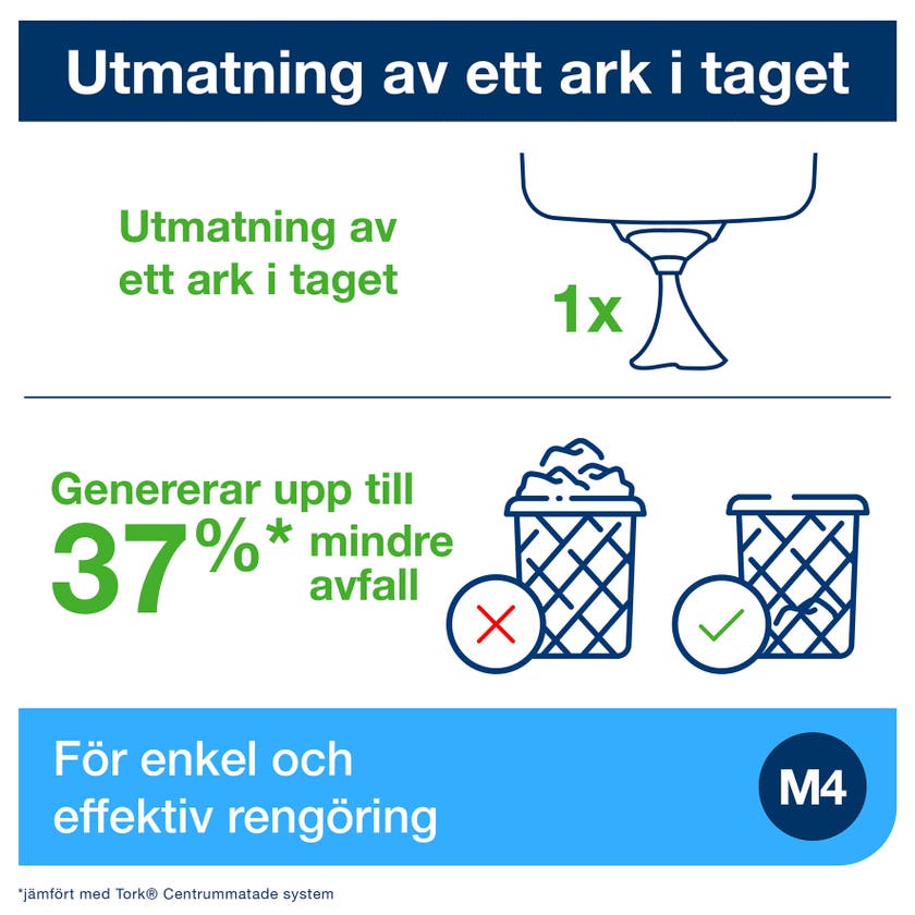 Tork Reflex® M4 Dispenser centrummatad är den perfekta lösningen för hand- och ytavtorkning i professionella miljöer och har utformats för att passa din miljös arbetsflöde. Vidrör endast det du använder med utmatning av ett ark i taget och nå pappret från vilken vinkel som helst med den roterande munstycksfunktionen.