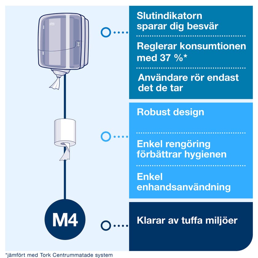 Detta lättanvända, hygieniska och slitstarka system minskar förbrukningen med upp till 37% jämfört med andra centrummatade dispensrar från Tork. Minskad risk för korskontaminering eftersom du endast vidrör det papper som du använder. Lätt att ta papper med bara en hand. Robust design gjord för att hålla i tuffa miljöer. Design som är lätt att rengöra tack vare den avtagbara kåpan. Slutindikatorn innebär att du aldrig behöver vara utan papper.