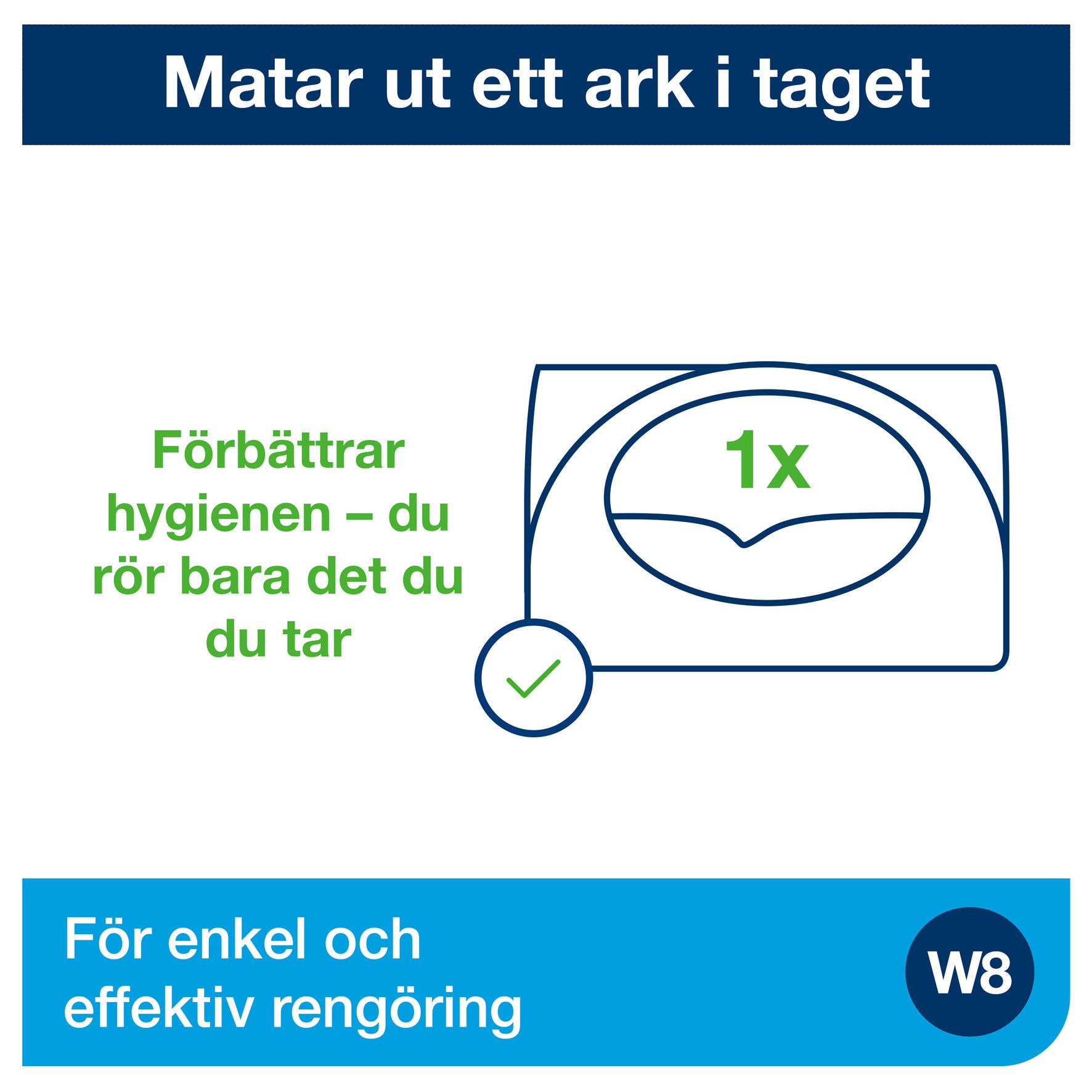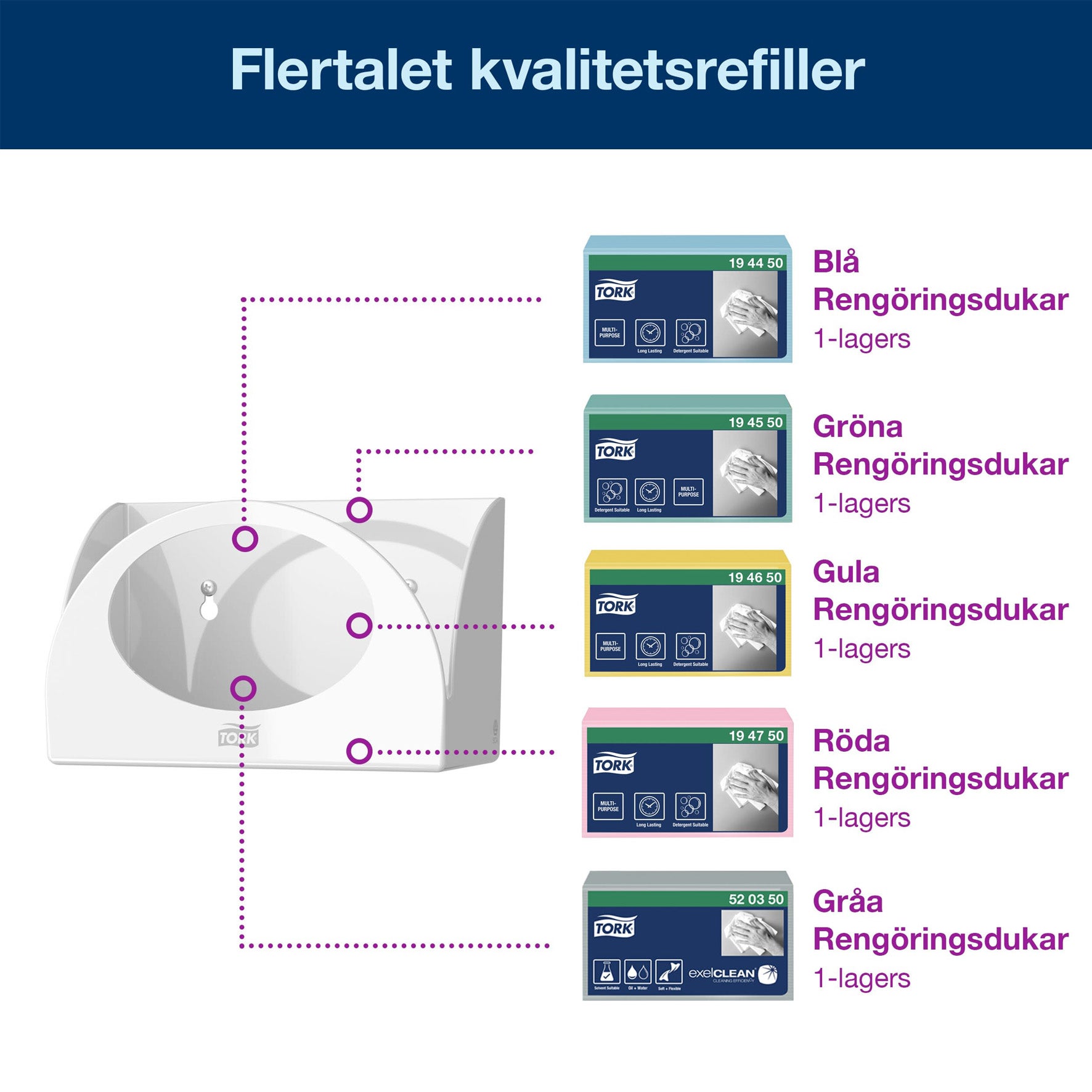 Rengöringsdukar som passar i denna dispenser - artikelnr: 2522207, 2522208, 2522206, 2522205, 8555729, 8556888.