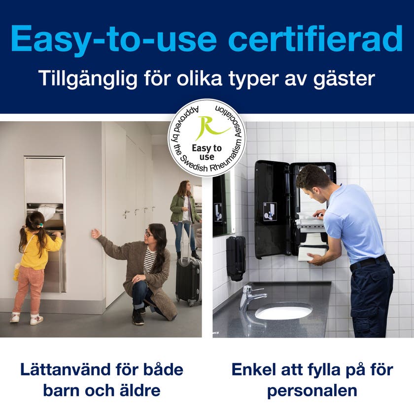 Det effektiva och flexibla systemet sparar tid åt personalen eftersom det kan fyllas på när som helst. Torks patenterade Continuous™-system är dessutom smidigt och enkelt att använda, och det förbättrar flödet genom att mata ut pappershanddukar på tre sekunder. Systemet är certifierat som ”Easy to use” av Svenska Reumatikerförbundet (SRA) och gör hygien tillgängligt för alla. Produkten är dessutom koldioxidneutral då den är tillverkad med certifierad, förnybar el och kompenserad med klimatprojekt. Dispensern är kompatibel med Tork EasyCube® mjukvara för facility management.