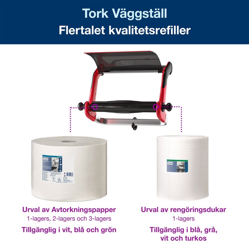 TORK Golv- och väggställ W1, för stora torkrullar. Tork Golvställ i Performance-design har utvecklats för säkerhet och stabilitet med funktioner för tillförlitlig avrivning och enkel påfyllning. Tork Performance är nästa generation av dispensrar för avtorkning i arbetsmiljöer. Rätt kombination av dispensrar och avtorkningspapper kommer att öka produktiviteten och samtidigt minska dina totala förbrukningskostnader. Mobil dispenser som kan placeras där du behöver den. Extra hög kapacitet sparar tid för påfyllning. Med enkelhet kan du dra av papper med endast en hand. Golvstället har en ergonomisk design, säker och pålitlig avrivning, stabil konstruktion och är enkel att ladda. Väggmonterad dispenser som kommer att spara värdefull golvyta.