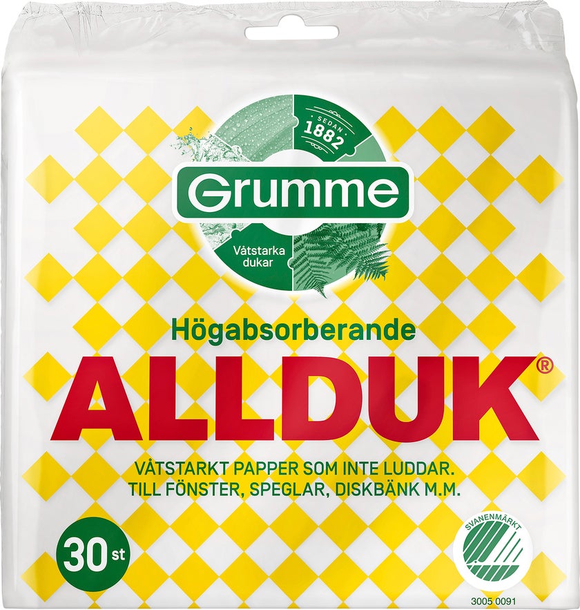 Allduk Grumme. Högabsorberande rengöringsdukar i våtstarkt papper som inte luddar. Utmärkt till fönster, speglar, diskbänk och andra ytor. Ej klorblekt.