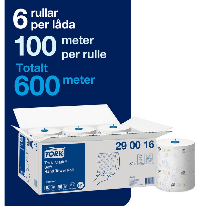 TORK Matic™ Mjuk Handduk på rulle är ett bra handtorkningsalternativ för alla toalettutrymmen. Med mjukt och skonsamt papper blir det ett perfekt avslut på varje handtvätt. Dessa pappershanddukar är tillverkade av TORK:s starkaste och mest absorberande papper. Rullarna är anpassade till TORK Matic™ Dispenser H1, som är framtagen för enkelt och lättskött underhåll i välbesökta toalettutrymmen. Dispensern kontrollerar förbrukningen av pappershanddukar genom att mata ut en i taget.