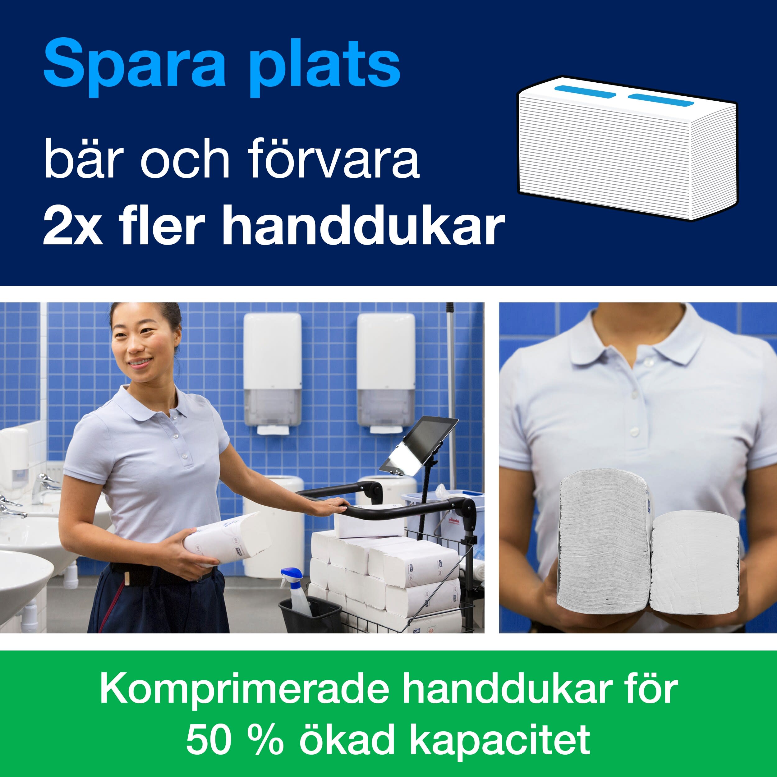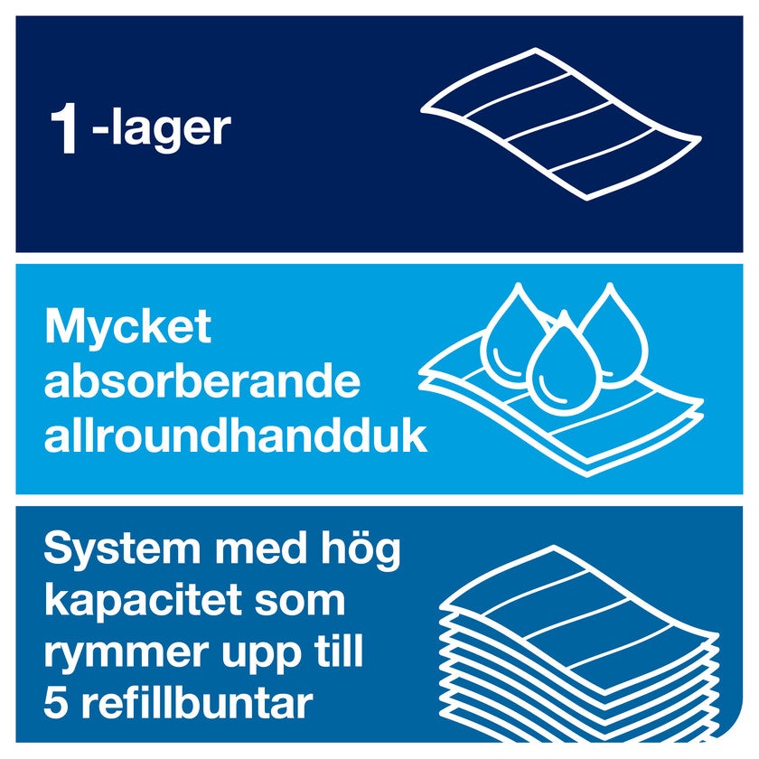 Med detta system är det möjligt att halvera tiden som spenderas på påfyllning, eftersom det finns utrymme för upp till 2100 handduksark per dispenser. Det är möjligt att fylla på när det passar dig, eftersom upp till 600 fler gäster kan besöka toaletten mellan varje påfyllning.