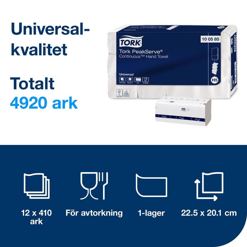 Tork PeakServe® Continuous™ pappershandduk H5. Välbesökta toalettutrymmen har sina utmaningar, inklusive pappersbrist, långa köer och handduksavfall – Tork PeakServe® Continuous™ pappershanddukar hjälper dig att undvika dessa problem. Med 250 % fler handdukar per dispenser behöver du inte fylla på lika ofta och får mer tid för städning. Torks patenterade Continuous™ handdukssystem säkerställer också att handdukar matas ut en i taget på under tre sekunder, även mellan buntar, vilket motverkar slöseri och papper som fastnar.