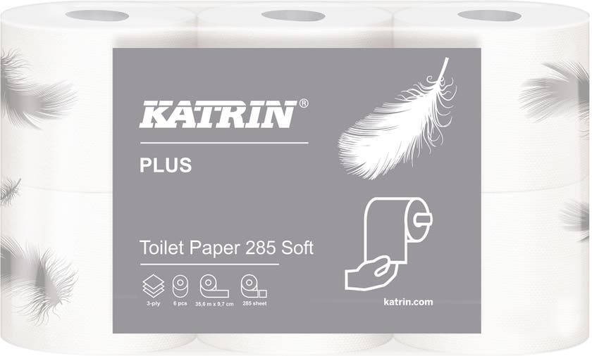 Toalettpapper Katrin Plus Toilet Soft 285 är små toalettrullar av högsta kvalitet. Har det lilla extra när det gäller skonsam torkning, absortionsförmåga och styrka. Förhöjer din imagen i exklusivare publika miljöer. Extra mjukt och starkt toalettpapper.