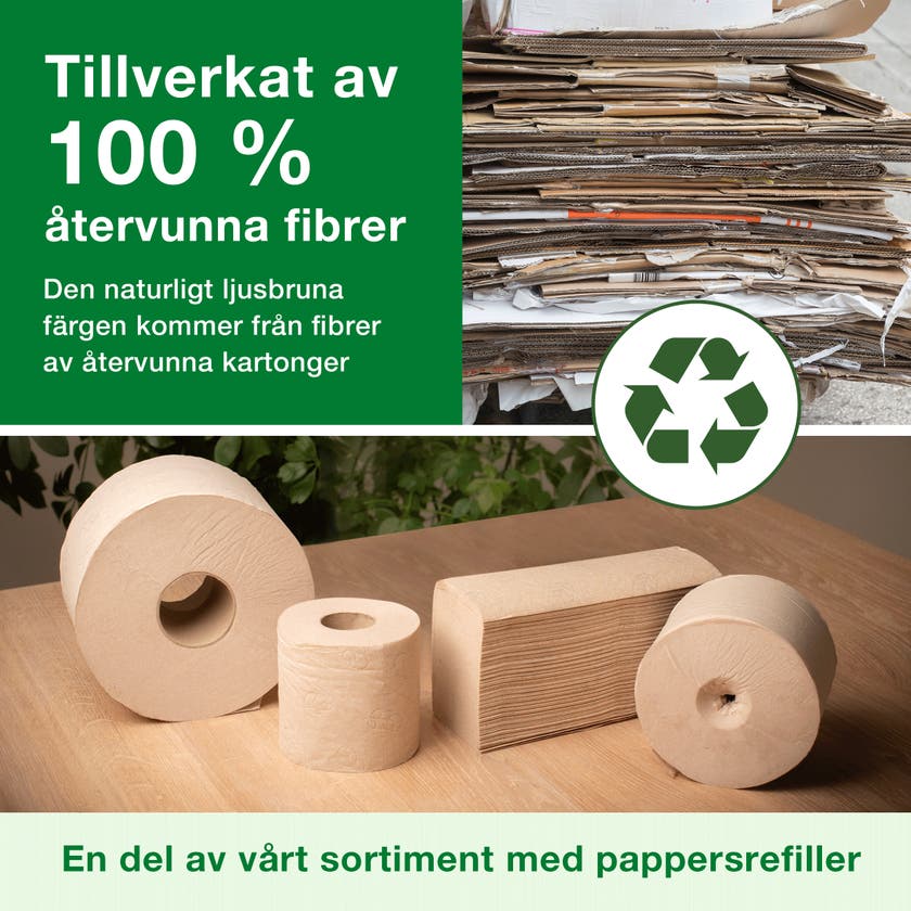 Pappret tillverkas av 100 % återvunna fibrer. Den naturligt ljusbruna färgen kommer från användning av återvunna kartonger. Inga färgämnen tillsätts vid tillverkningen. Minskar risken för pappersbrist genom att använda pappret med en av Torks dispensrar med hög kapacitet.