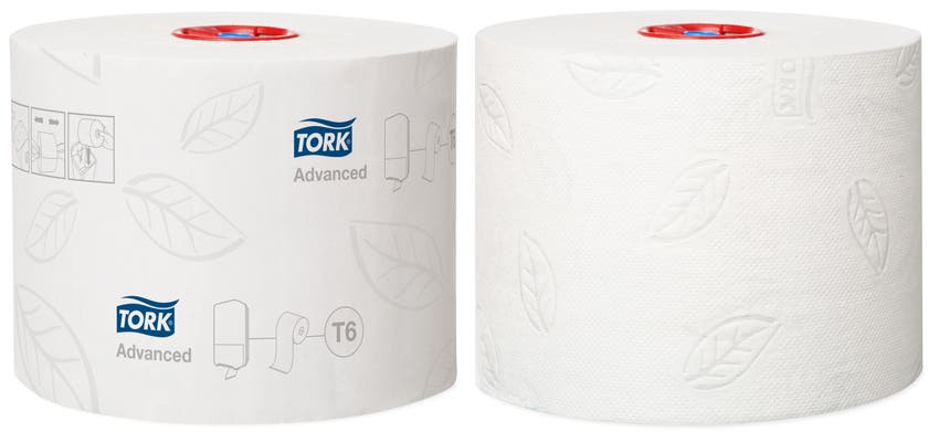 Med TORK Mid-size Toalettpapper T6 får ni aldrig slut på papper. Risken är åtminstone väldigt liten, tack vare att en rulle motsvarar 4-5 vanliga toalettpappersrullar och att de är anpassade till en dispenser med Twin-funktion som ser till att en ny rulle automatiskt faller på plats när en tar slut. Ett modernt och effektivt system.