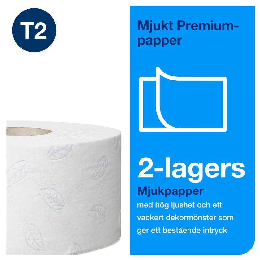 Tork Soft Mini Jumbo Toalettpapper vitt T2 Premium. Systemet Tork Mini Jumbo ger en effektiv tidsanvändning och lägre kostnader, samtidigt som det erbjuder betydligt mer toalettpapper än vanliga standardrullar. Detta 2-lagers Soft Mini Jumbo-toalettpapper kombinerar förstklassigt utseende, känsla och prestanda, vilket gör det perfekt för platser med medelhög till hög besöksfrekvens.