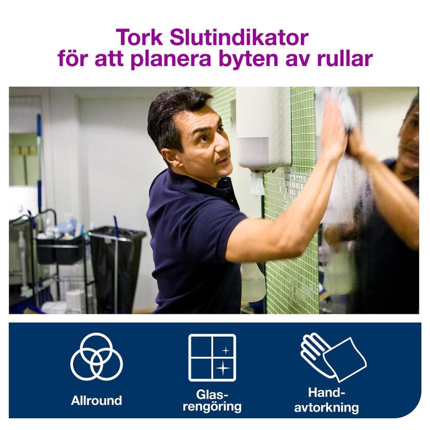Ett handtorkningspapper som med sin obegränsade utmatning och höga absorptionsförmåga är oklanderligt när det kommer till att torka händer och ytor. Systemet är flexibelt eftersom du kan ta precis så mycket eller lite du vill. Använd det med en centrummatad dispenser med hög kapacitet för enkel enhandsutmatning, vilket kommer att göra personalen effektivare. Slutindikator hjälper till att visa när det är dags att byta rullar och förhindrar oönskade avbrott i personalens arbetsflöde.