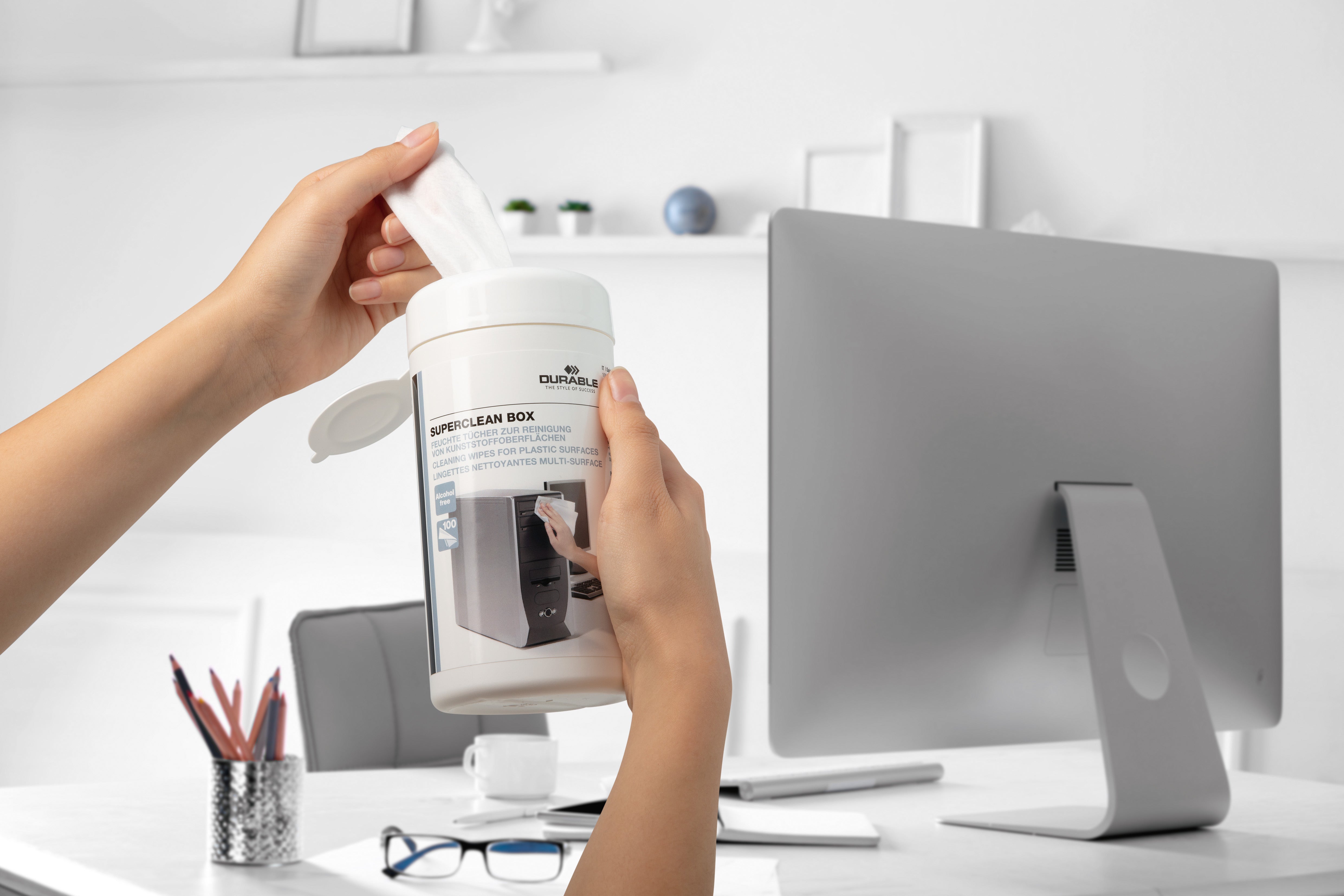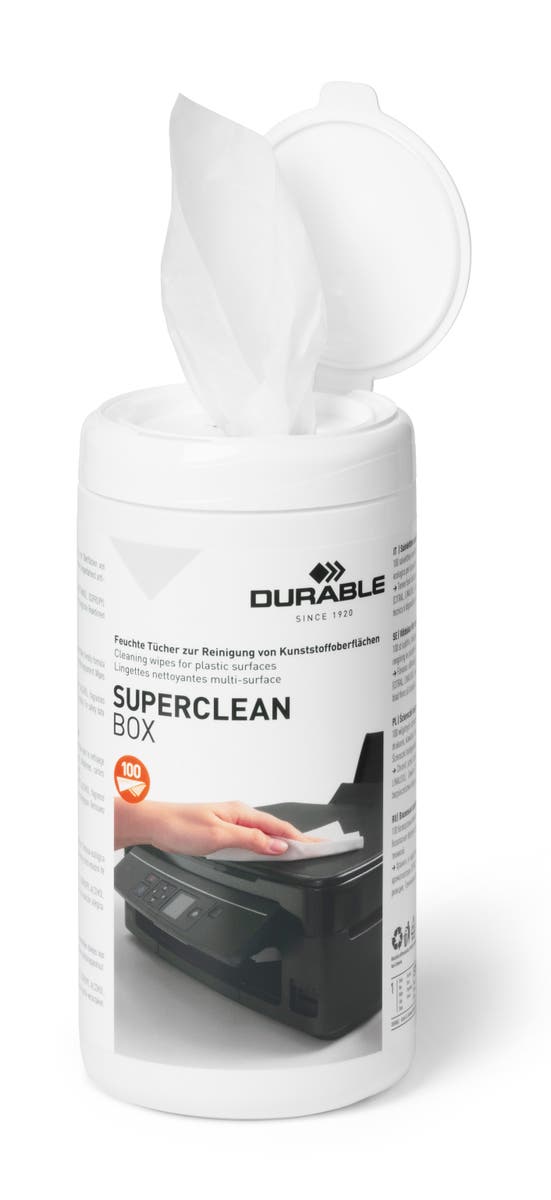 Superclean Box är en praktisk burk med 100 fuktiga rengöringsservetter. Används vid rengöring av plastytor som exempelvis datorhölje, datormus, skrivare, telefoner och andra kontorsmaskiner. Servetterna har antistatisk effekt och är biologiskt nedbrytbara. Se till att hålla din utrustning fräsch och i gott skick genom en regelbunden rengöringsrutin.