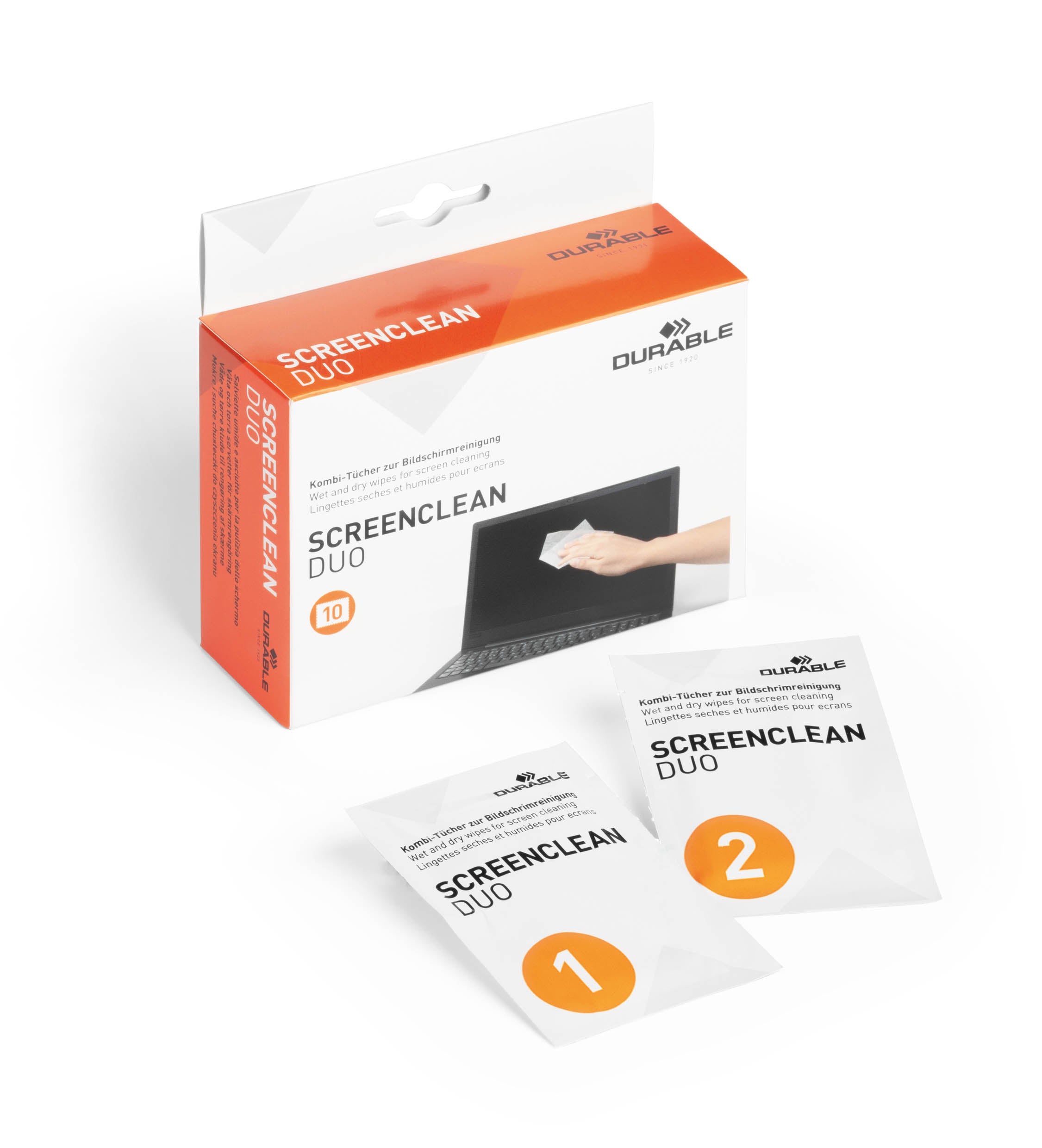 Våt- och torkduk duo – skärm och glas. Håll dator, skrivare, tangentbord, telefoner och bord fräscha och i gott skick genom en regelbunden rengöringsrutin. 10 set med våt-/torrdukar för rengöring av bildskärmar, laptops eller glasytor på kopieringsmaskiner och skannrar. Rengör först med den fuktiga rengöringsservetten och eftertorka med torkduken. Luddfria och biologiskt nedbrytbara.