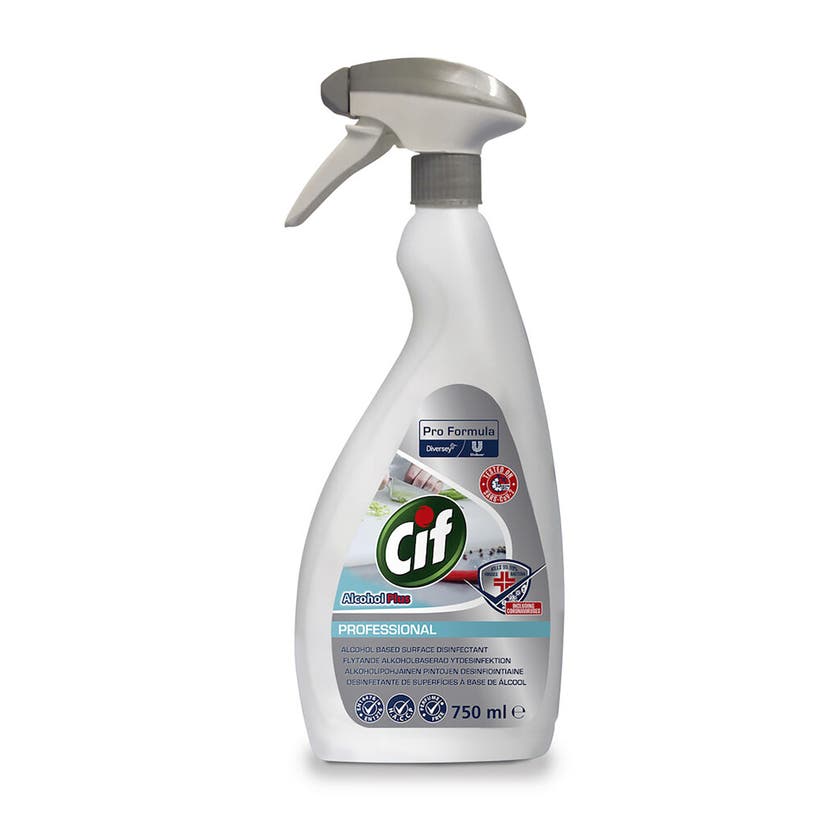 Ytdesinfektion Cif Pro+. Cif Alcohol Plus Pro Formula. Etanolbaserad desinfektionsspray för användning i köks- och livsmedelsmiljöer. Säker att använda på livsmedelsytor då den avdunstar utan att lämna produktrester. Ex. skärbrädor, redskap, termometrar och annan mindre livsmedelsutrustning.
